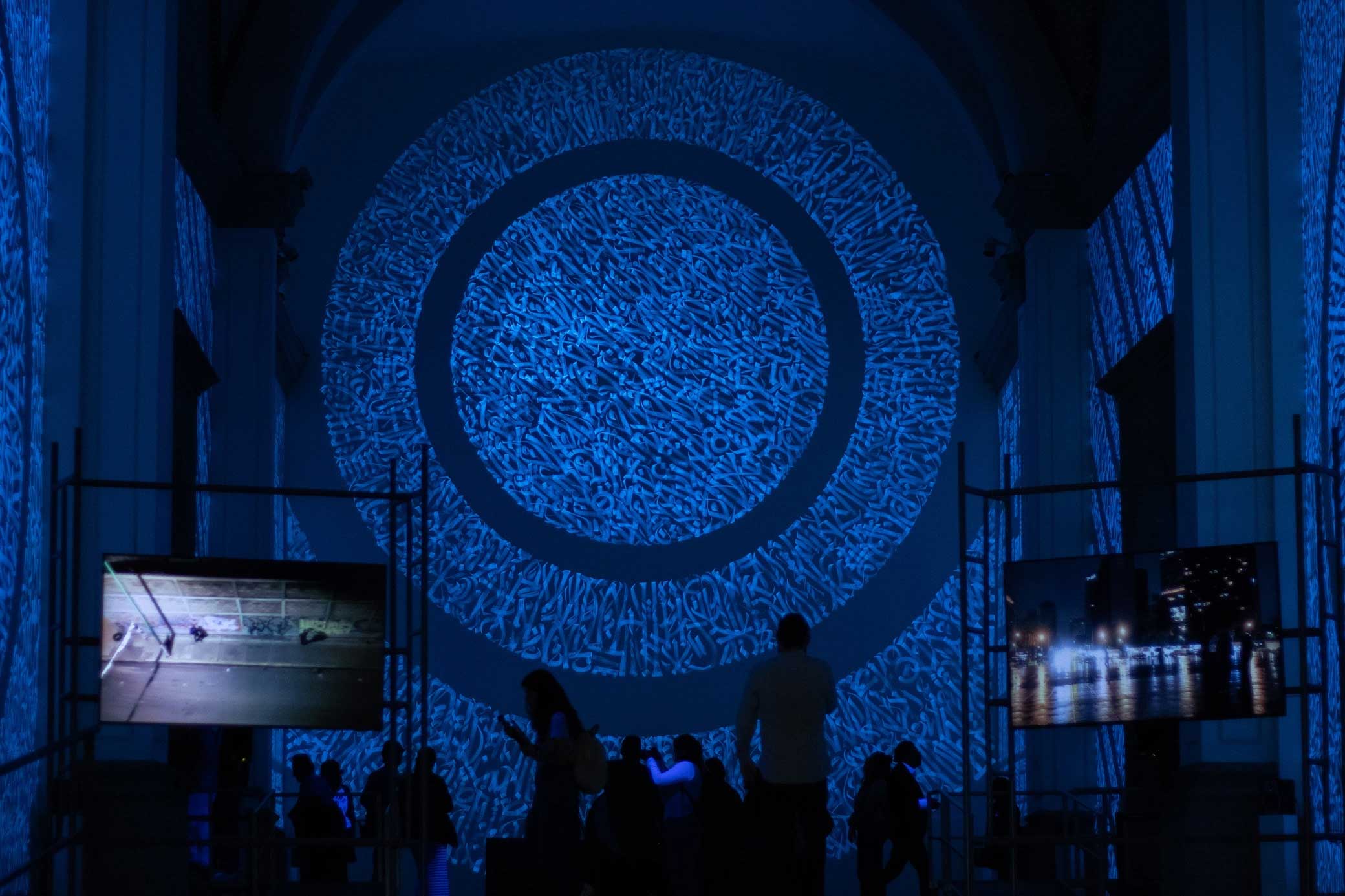 Intervención en los muros de la nave central del antiguo templo. Pintada con pigmentos visibles bajo luz ultravioleta, surge de caminatas por el entorno inmediato del museo y condensa esas derivas en formas visuales que escapan a lo legible.