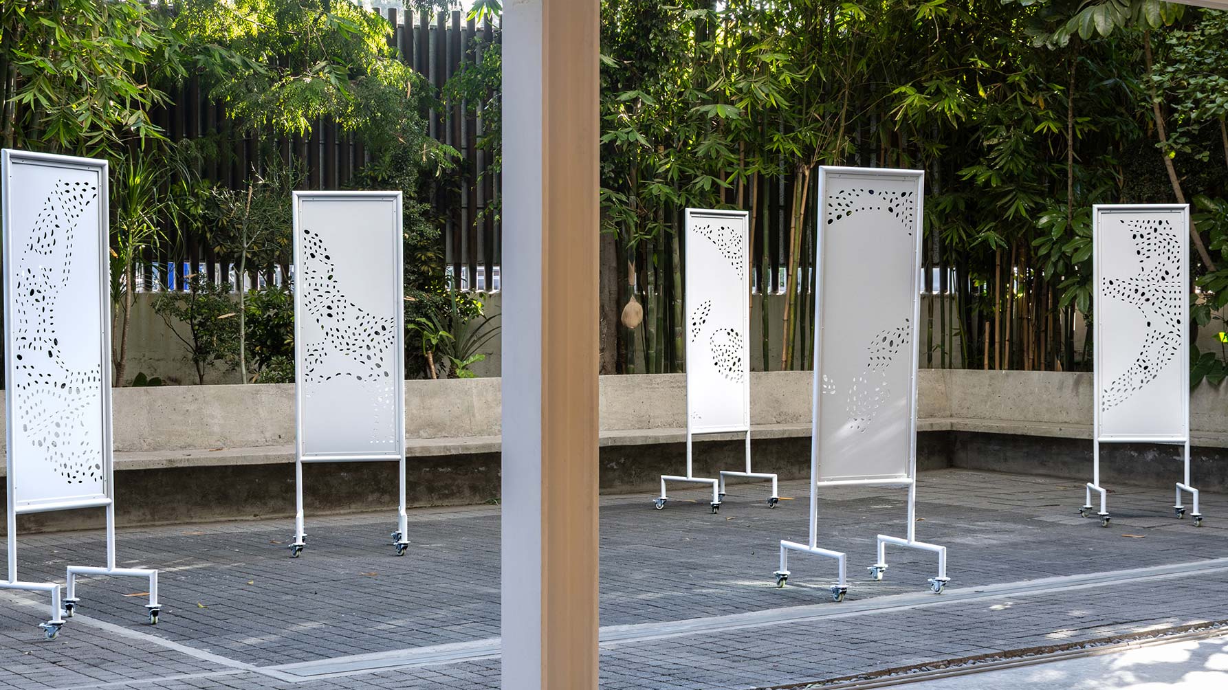 En esta pieza interactiva de la artista Cecilia Miranda, se invita a lxs visitantes a insertar módulos de acrílico y desplazar muros móviles, generando proyecciones lumínicas que simulan el flujo de esporas al respirar.