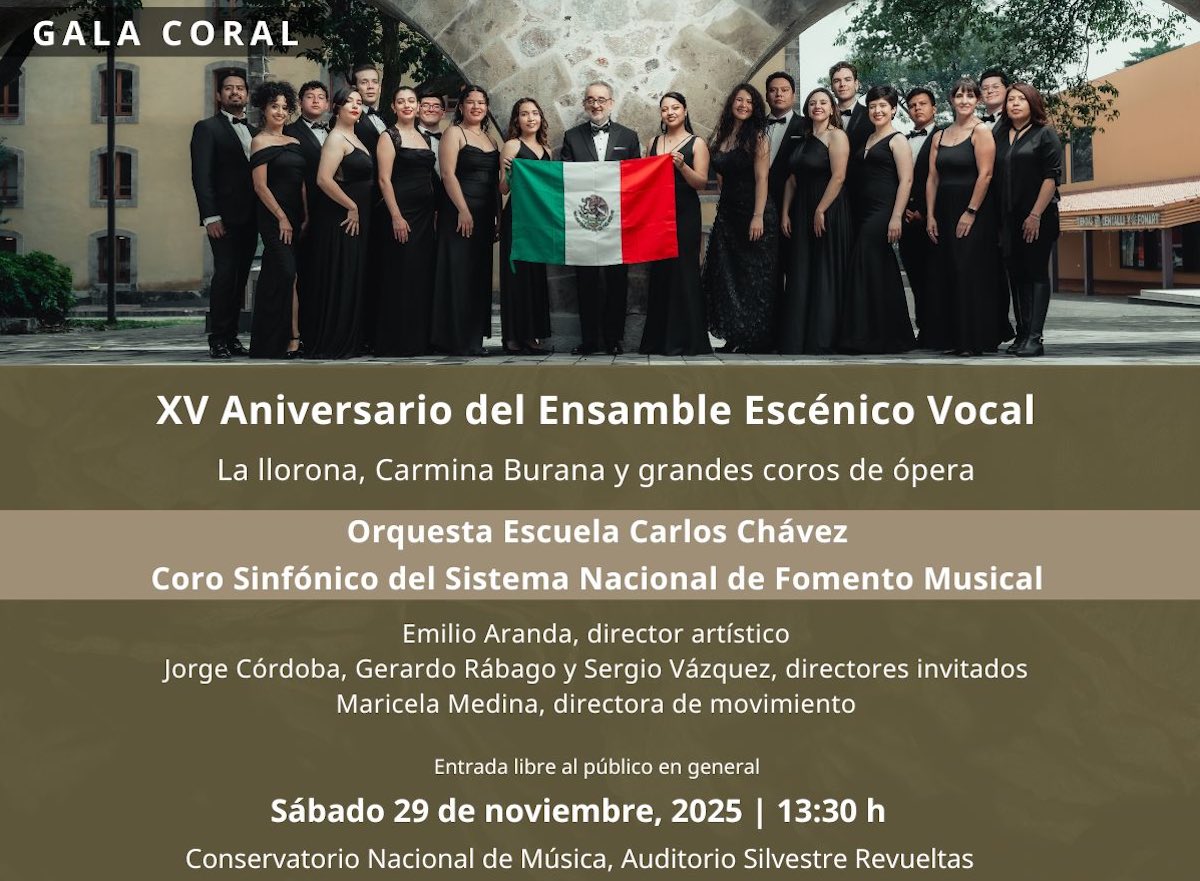 Actividad artístico-académica organizada por el Conservatorio Nacional de Música, con la participación de la Orquesta Escuela Carlos Chávez y el Coro Sinfónico del Sistema Nacional de Fomento Musical. Este programa conmemorativo celebra quince años de trayectoria del Ensamble Escénico Vocal con un recorrido por obras corales emblemáticas y arreglos sinfónico-corales, destacando el trabajo formativo y colaborativo entre agrupaciones del sistema artístico nacional.