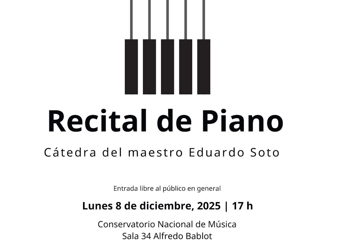 Actividad artística del Conservatorio Nacional de Música. Presenta a las y los estudiantes de la cátedra del maestro Eduardo Soto en un programa pianístico que abarca obras de distintas épocas y estilos, subrayando el trabajo técnico e interpretativo desarrollado en la formación superior del instrumento.