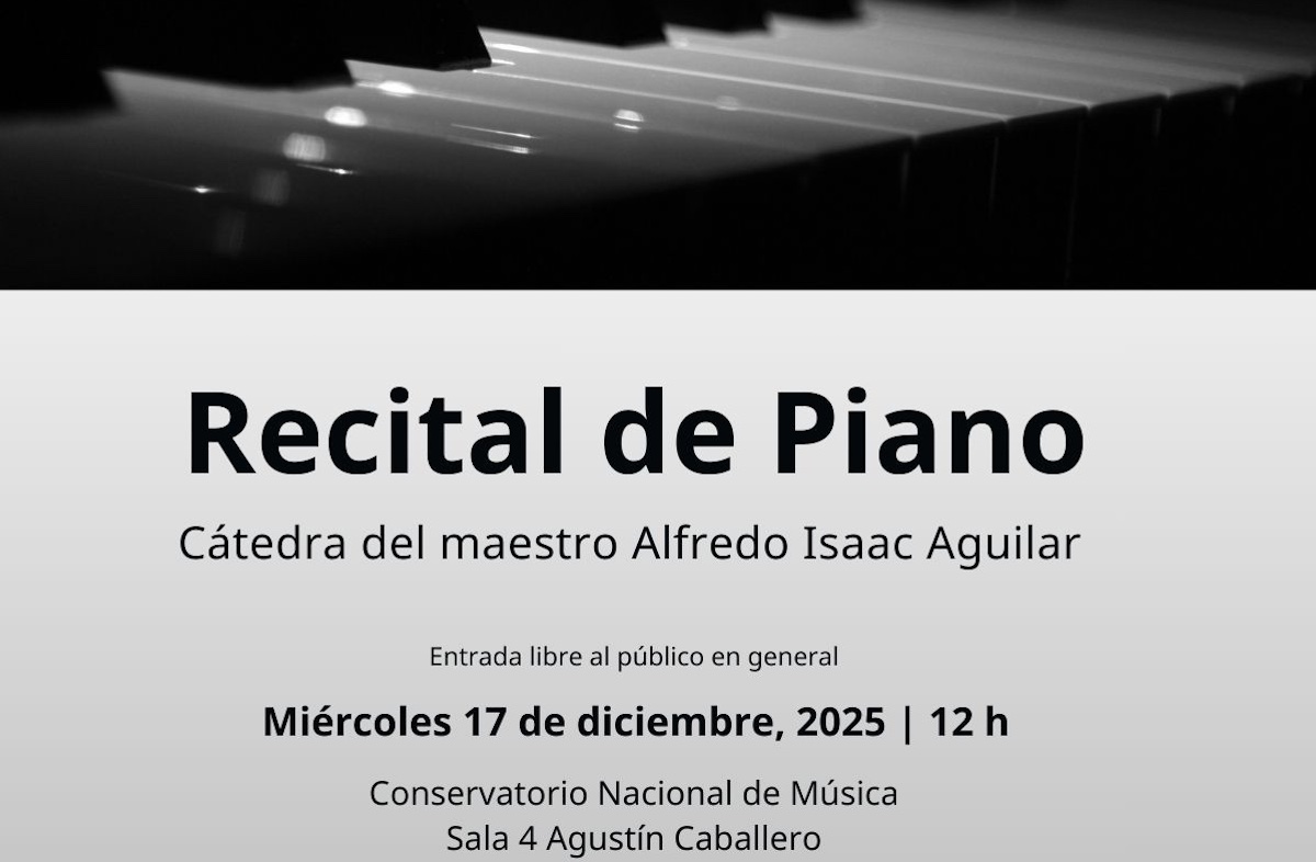 Actividad artística del Conservatorio Nacional de Música. Presenta a las y los estudiantes de la cátedra del maestro Alfredo Isaac Aguilar en un programa que abarca obras de distintas épocas y estilos del repertorio pianístico, destacando el desarrollo técnico, la musicalidad y la interpretación en el marco de la formación superior del instrumento.