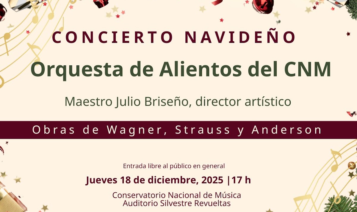 Actividad artística del Conservatorio Nacional de Música. Presenta a la Orquesta de alientos del CNM, bajo la dirección artística del maestro Julio Briseño, en un programa de temporada integrado por obras de Wagner, Strauss y Anderson, que adapta repertorio sinfónico y piezas festivas al formato de banda de alientos.