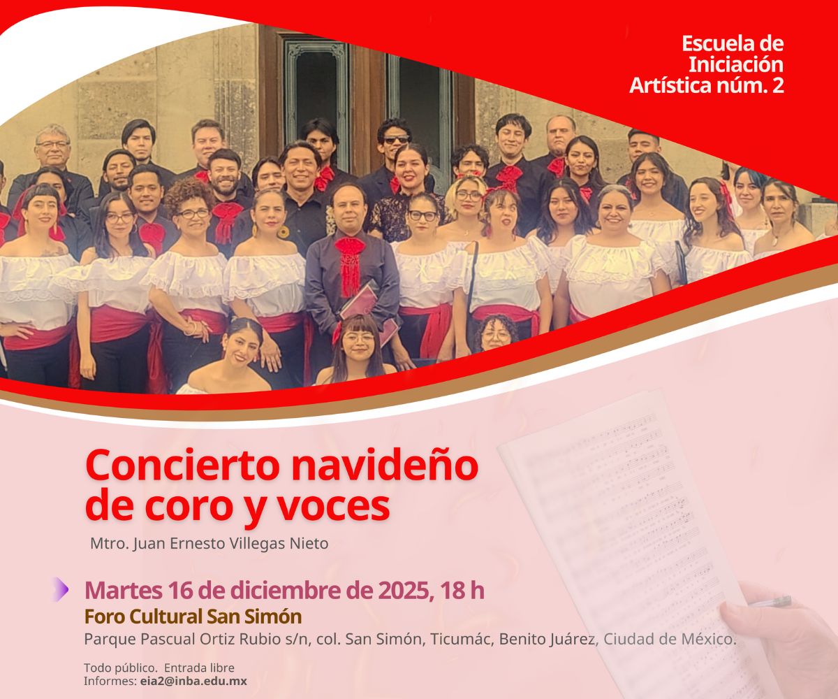 Actividad artística de la Escuela de Iniciación Artística Núm. 2. Presenta un programa coral y vocal de temporada bajo la dirección del maestro Juan Ernesto Villegas Nieto, integrado por obras y arreglos navideños que enfatizan el trabajo en conjunto, la práctica del canto colectivo y la diversidad de voces que conforman la comunidad escolar.