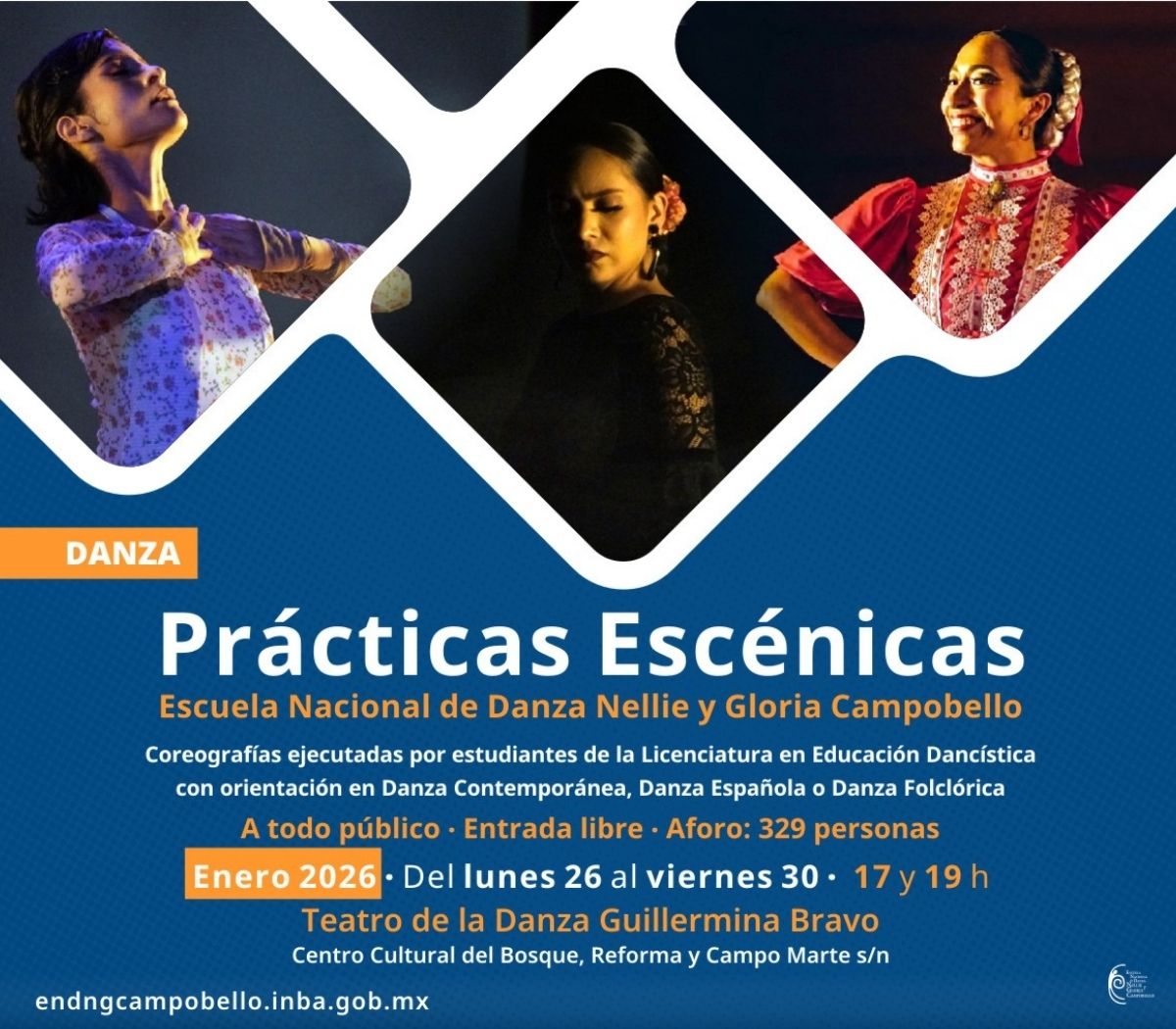 Actividad artística de la Escuela Nacional de Danza Nellie y Gloria Campobello. Presenta coreografías ejecutadas por estudiantes de la Licenciatura en Educación Dancística con orientación en danza contemporánea, danza española o danza folklórica, en el marco de un programa de prácticas escénicas que articula distintos lenguajes y estilos dancísticos.