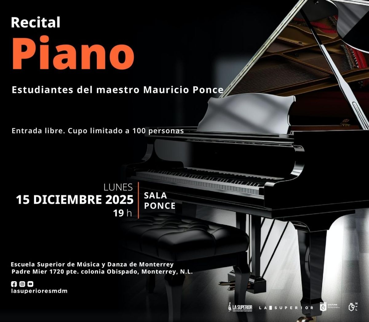 Actividad artística de la Escuela Superior de Música y Danza de Monterrey. Presenta a estudiantes del maestro Mauricio Ponce en un programa pianístico que recorre obras de diferentes estilos y periodos, en el marco de su formación técnica e interpretativa.