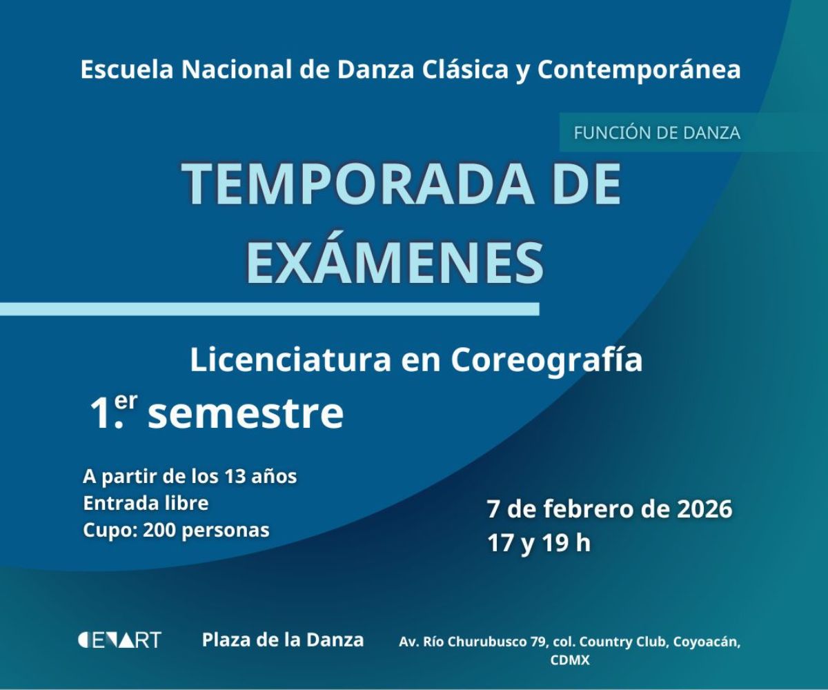 Actividad académico-artística de la Escuela Nacional de Danza Clásica y Contemporánea. Presenta los exámenes del primer semestre de la Licenciatura en Coreografía, en los que el estudiantado muestra avances en procesos de creación, composición y resolución escénica a partir del trabajo realizado durante el periodo académico.