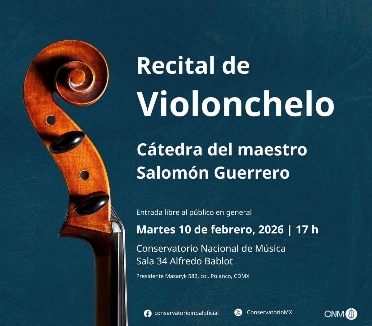 Actividad artístico-académica del Conservatorio Nacional de Música. Presenta a las y los estudiantes de la cátedra del maestro Salomón Guerrero en un programa que recorre obras representativas del repertorio para violonchelo, con énfasis en el desarrollo técnico, la expresión musical y el trabajo interpretativo en formatos solistas y de cámara.
