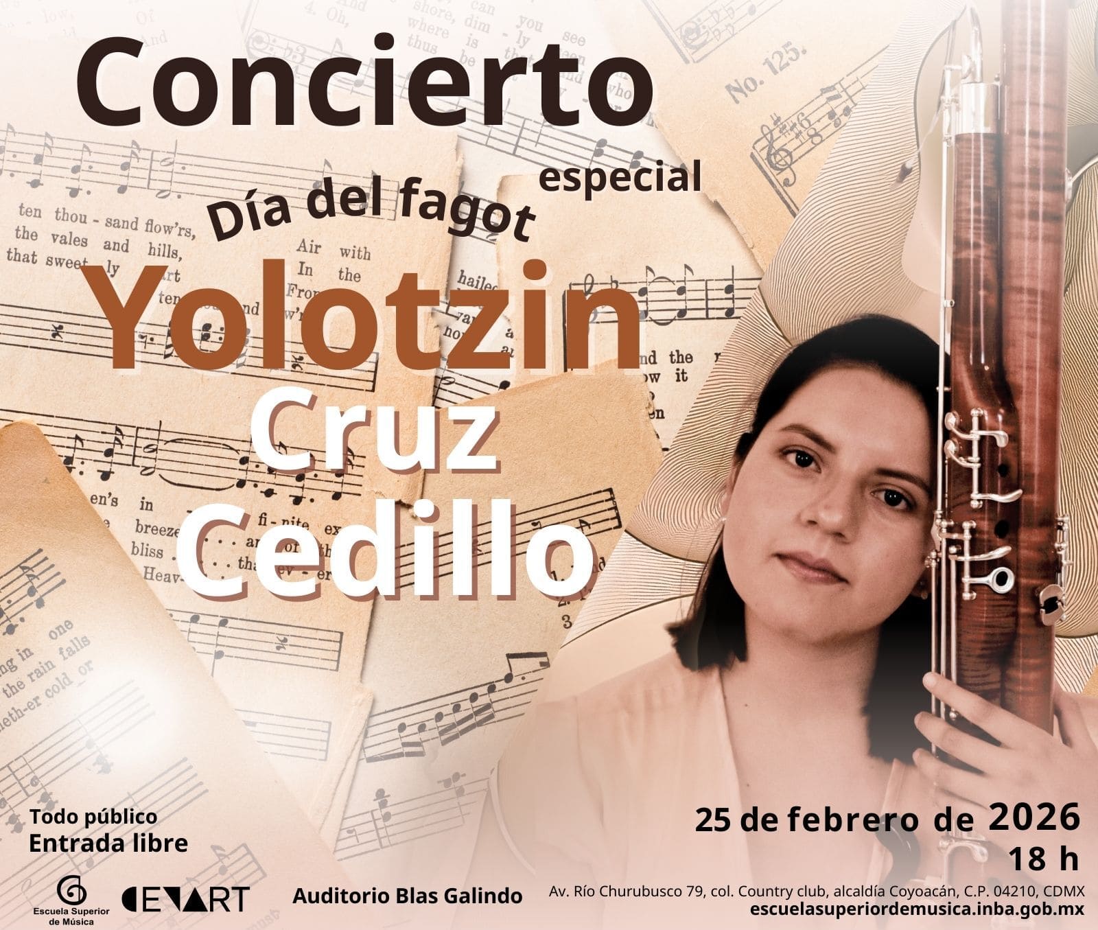 Actividad artístico-académica de la Escuela Superior de Música. Presenta a Yolotzin Cruz Cedillo en un programa especial dedicado al fagot, que explora las posibilidades expresivas y técnicas del instrumento mediante obras de distintos estilos y periodos.