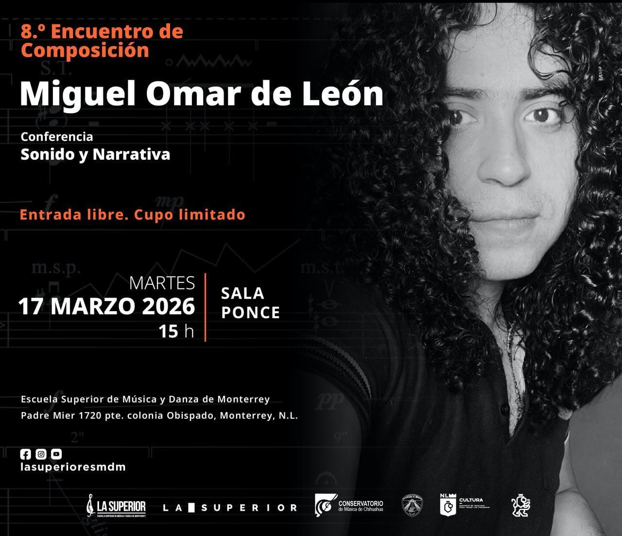 Actividad académica presentada en el marco del 8.° Encuentro de Composición de la Escuela Superior de Música y Danza de Monterrey. A cargo de Miguel Omar de León, aborda las relaciones entre sonido y narrativa desde perspectivas compositivas, explorando estrategias de construcción de sentido, temporalidad y discurso en la creación musical contemporánea.