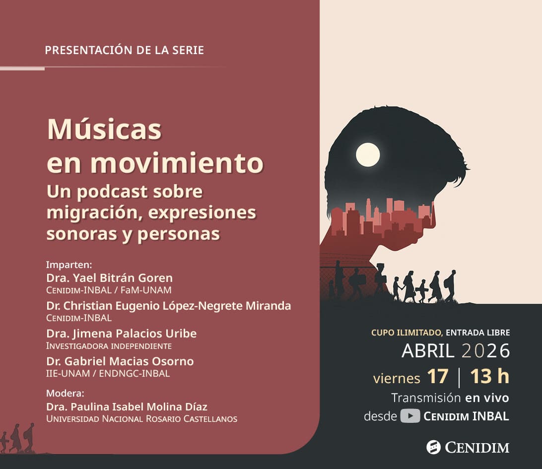 Actividad académica del Centro Nacional de Investigación, Documentación e Información Musical. Presentan la Dra. Yael Bitrán Goren, el Dr. Christian Eugenio López-Negrete Miranda, la Dra. Jimena Palacios Uribe y el Dr. Gabriel Macías Osorno, quienes introducen esta serie de podcast dedicada a explorar vínculos entre migración, expresiones sonoras y experiencias humanas, desde perspectivas interdisciplinarias de investigación musical y cultural.
