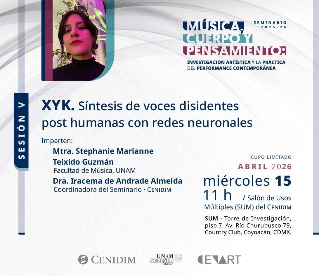 Actividad académica del Centro Nacional de Investigación, Documentación e Información Musical, presentada en el marco del seminario Música, Cuerpo y Pensamiento: Investigación Artística y la Práctica del Performance Contemporánea. A cargo de la Mtra. Stephanie Marianne Teixido Guzmán y la Dra. Iracema de Andrade Almeida, aborda la síntesis de voces disidentes posthumanas mediante redes neuronales, explorando cruces entre tecnología, identidad, sonido y experimentación performativa.
