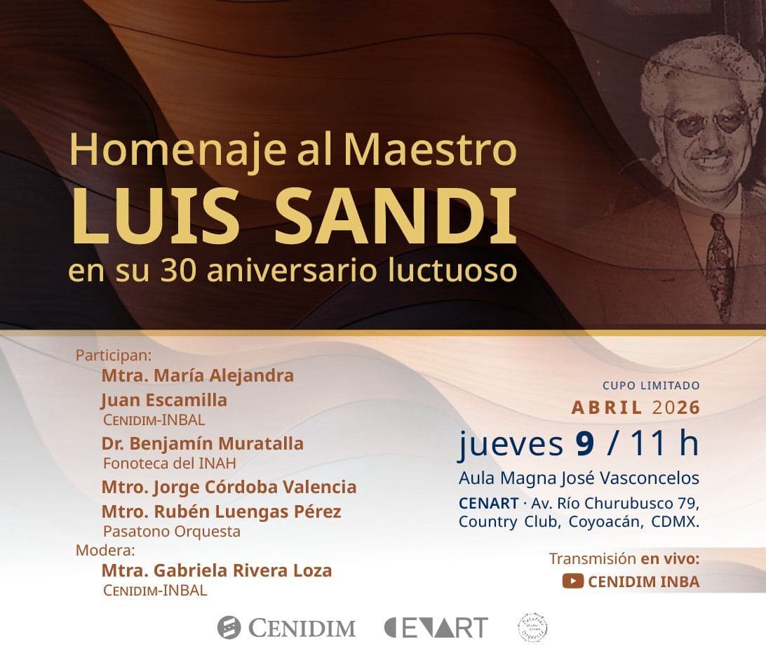 Actividad del Centro Nacional de Investigación, Documentación e Información Musical. Conmemora el 30 aniversario luctuoso del maestro Luis Sandi, compositor, pedagogo e investigador musical mexicano, mediante un programa que reúne reflexiones sobre su trayectoria, su aporte a la educación musical y la difusión de su obra en el contexto de la música mexicana del siglo XX.