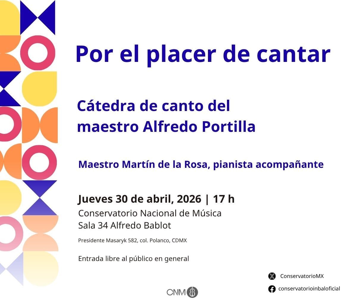 Actividad artística del Conservatorio Nacional de Música. Presenta al estudiantado de la cátedra de canto del maestro Alfredo Portilla, con el acompañamiento al piano del maestro Martín de la Rosa, en un programa vocal que recorre obras de distintos estilos y periodos, destacando el desarrollo técnico, la interpretación y el disfrute del repertorio lírico.