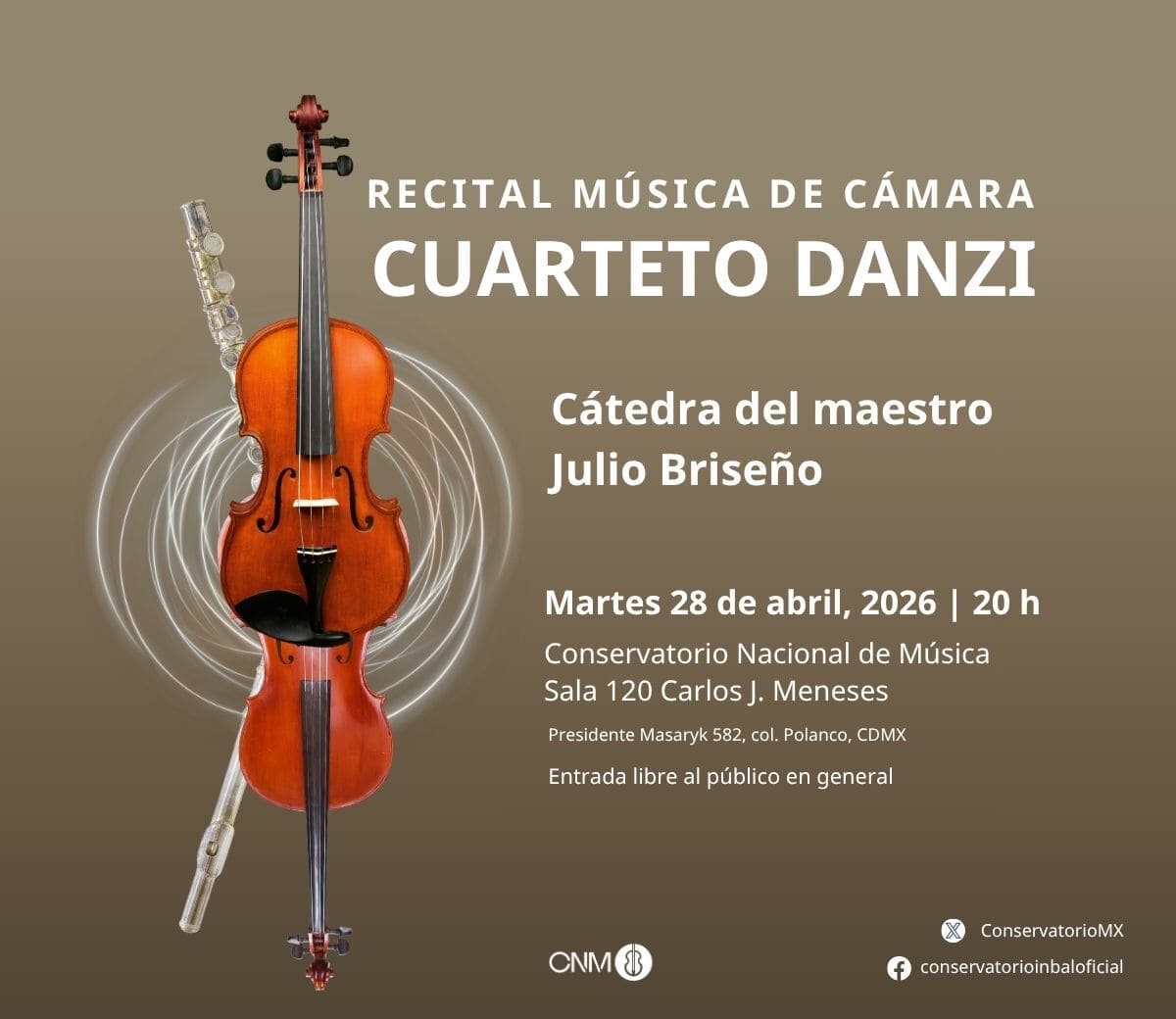 Actividad artística del Conservatorio Nacional de Música. Presenta al Cuarteto Danzi, perteneciente a la cátedra del maestro Julio Briseño, en un programa dedicado al repertorio de cámara que destaca el trabajo de ensamble, la precisión técnica y la cohesión interpretativa desarrollada por sus integrantes.