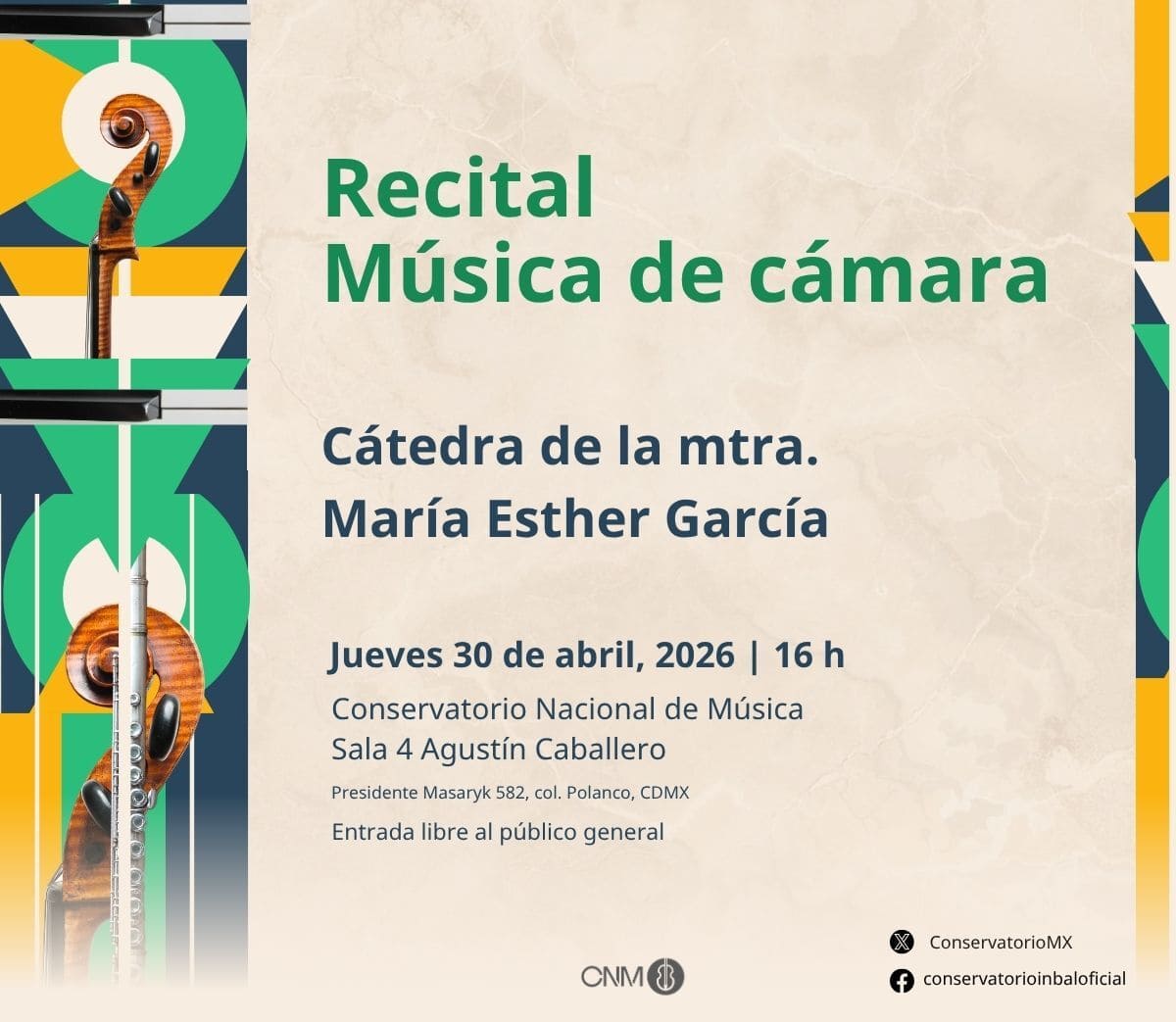 Actividad artístico-académica del Conservatorio Nacional de Música. Presenta al estudiantado de la cátedra de la maestra María Esther García en un programa dedicado al repertorio de cámara, destacando el trabajo de conjunto, la precisión técnica y la cohesión interpretativa en diversas formaciones instrumentales.