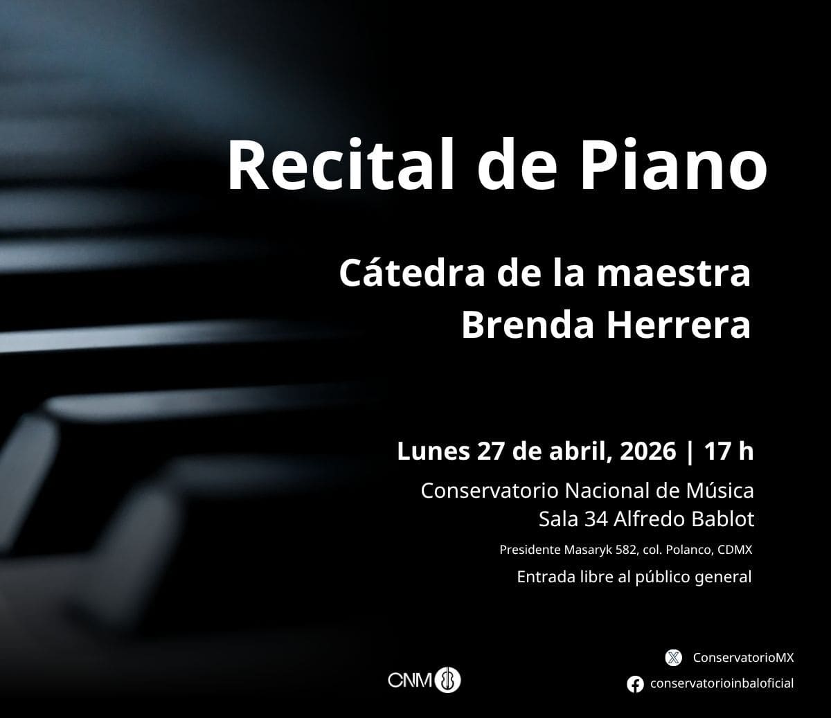 Actividad artístico-académica del Conservatorio Nacional de Música. Presenta al estudiantado de la cátedra de la maestra Brenda Herrera en un programa que recorre obras representativas del repertorio pianístico, destacando el desarrollo técnico y la madurez interpretativa alcanzada durante el proceso formativo en el instrumento.