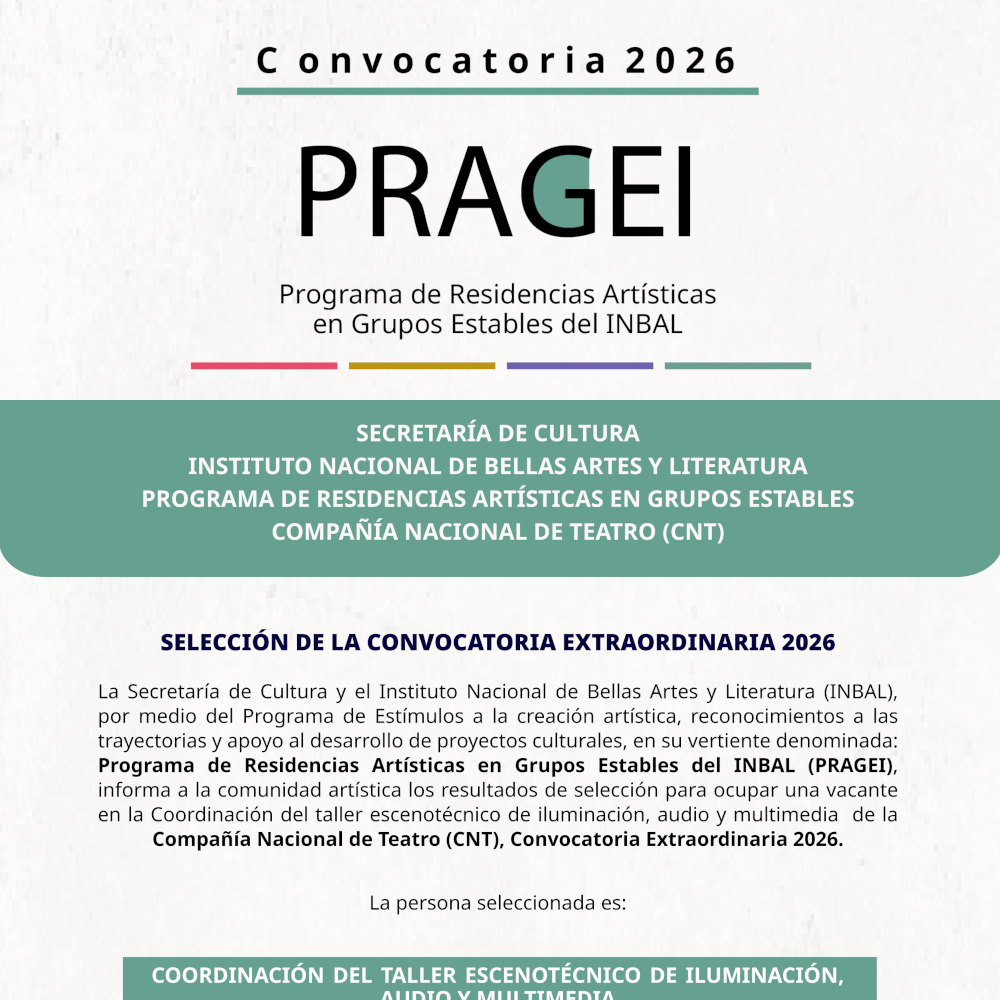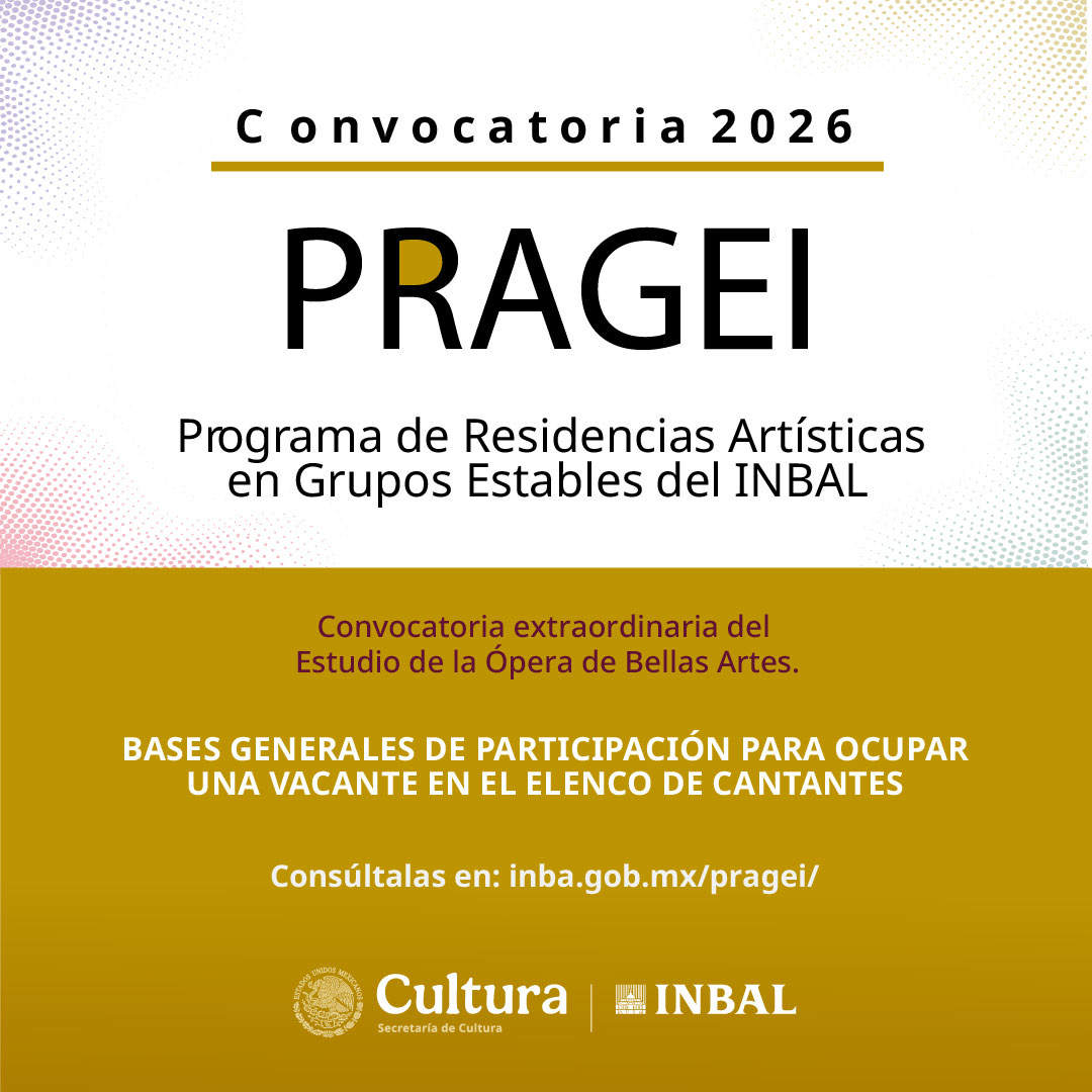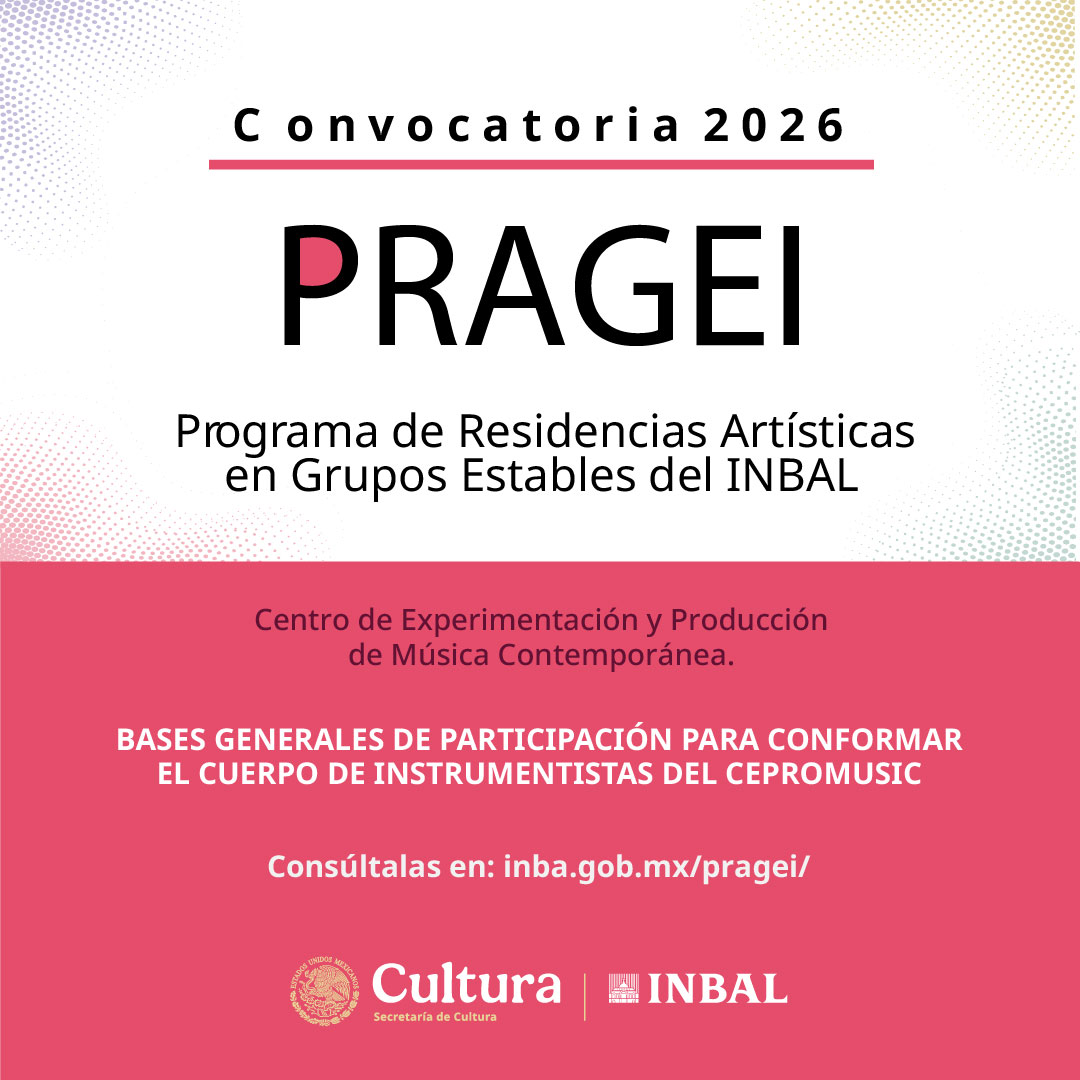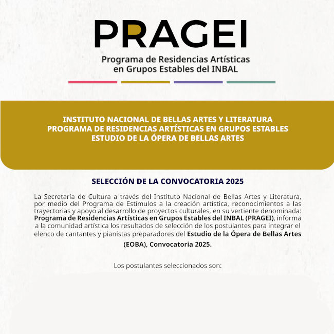 El Programa de Residencias Artísticas de Grupos Estables del INBAL (PRAGEI) tiene como propósito el desarrollo profesional de los artistas escénicos a partir de su incorporación como residentes a uno de los cuatro Grupos Estables del INBAL: Compañía Nacional de Teatro (CNT), Centro de Experimentación y Producción de Música Contemporánea (Cepromusic), Centro de Producción de Danza Contemporánea (Ceprodac) y el Estudio de la Ópera de Bellas Artes (EOBA). Estas residencias son de carácter nacional y se integrarán a través de convocatorias públicas.
