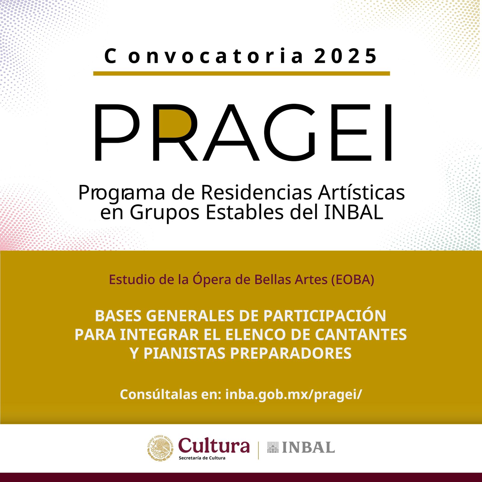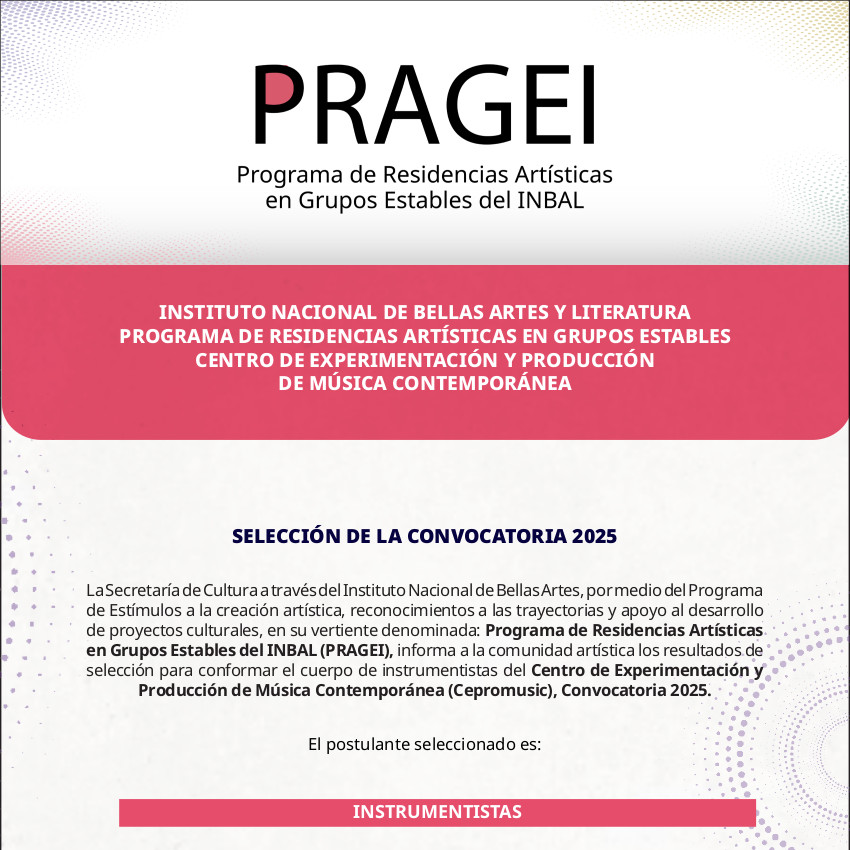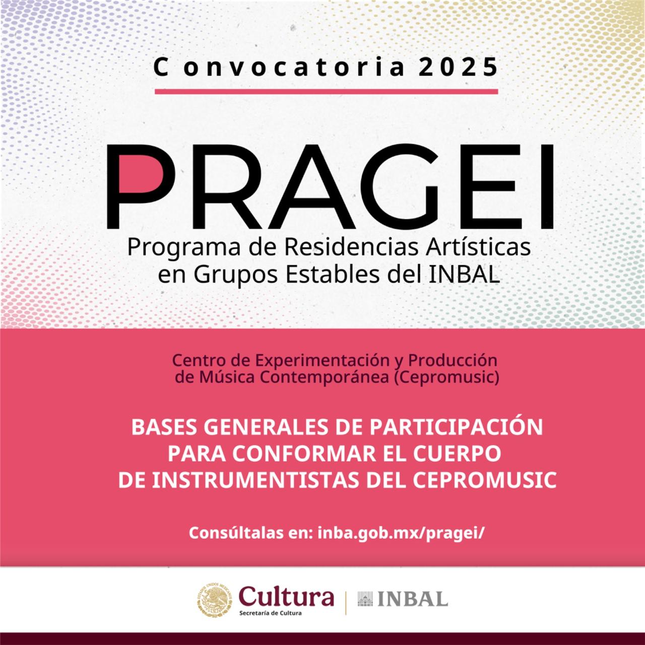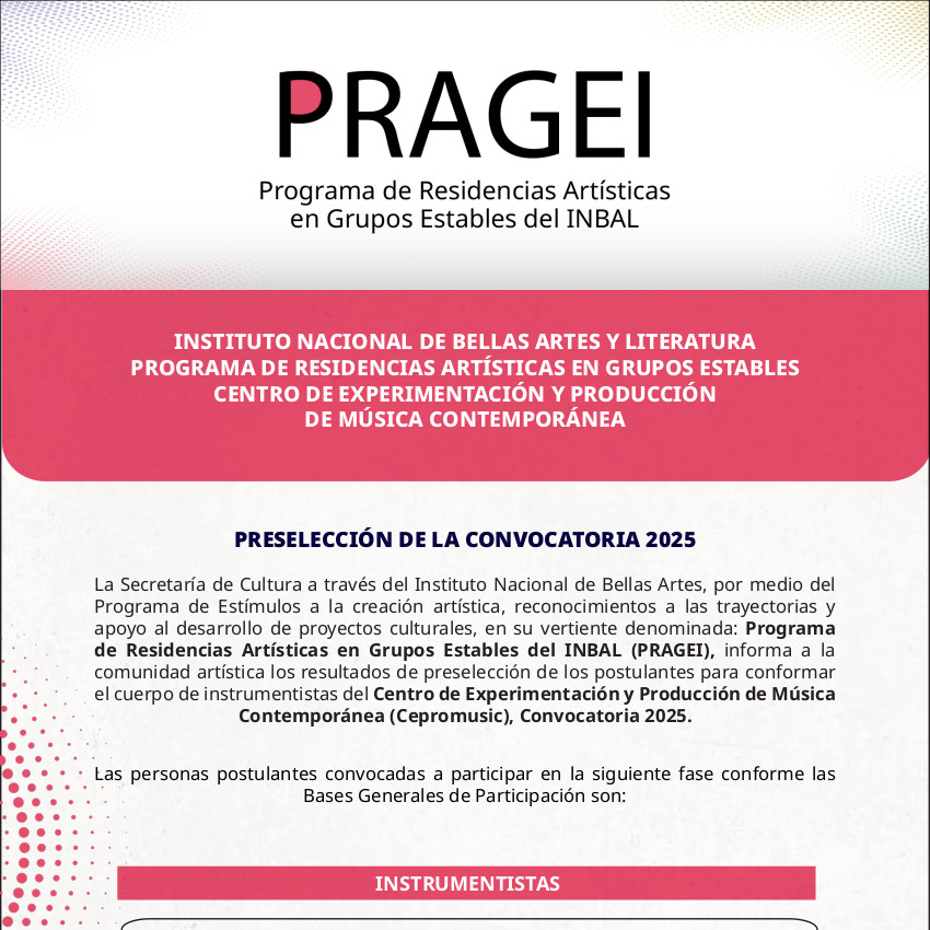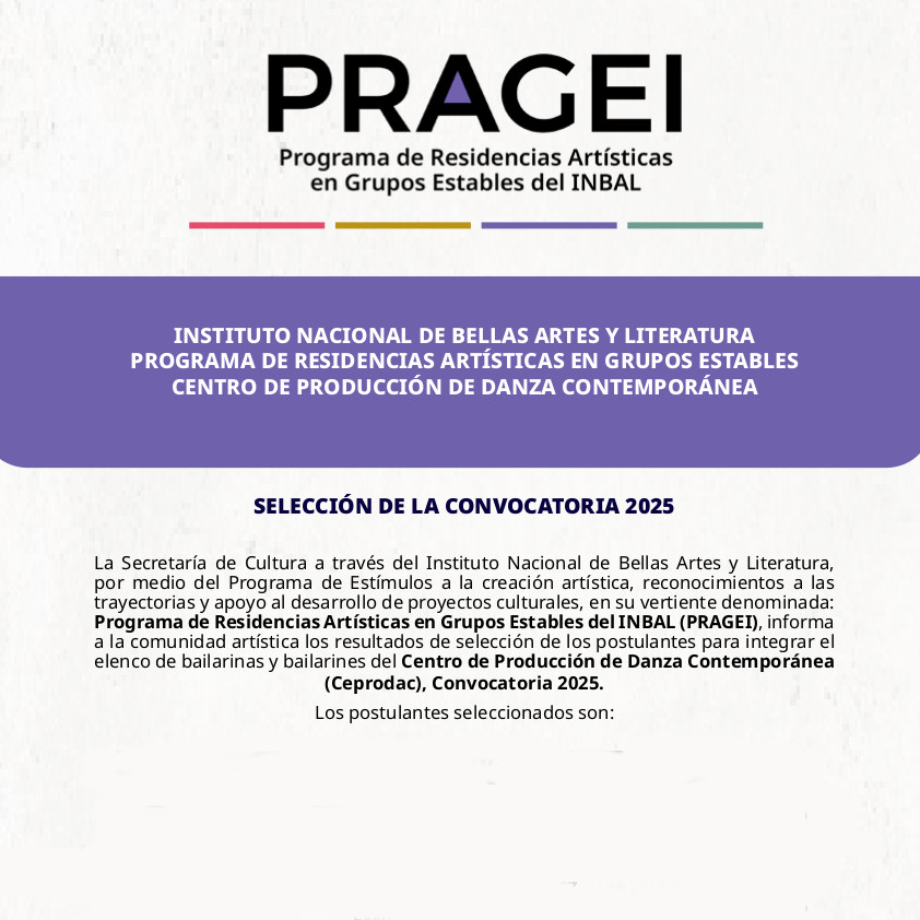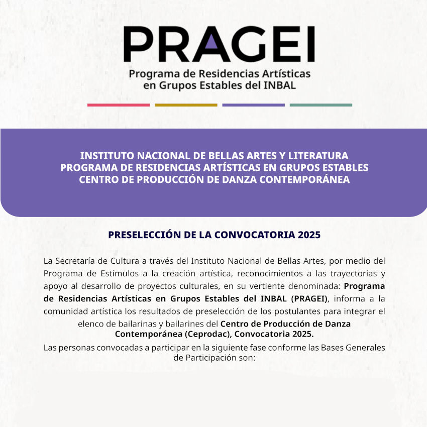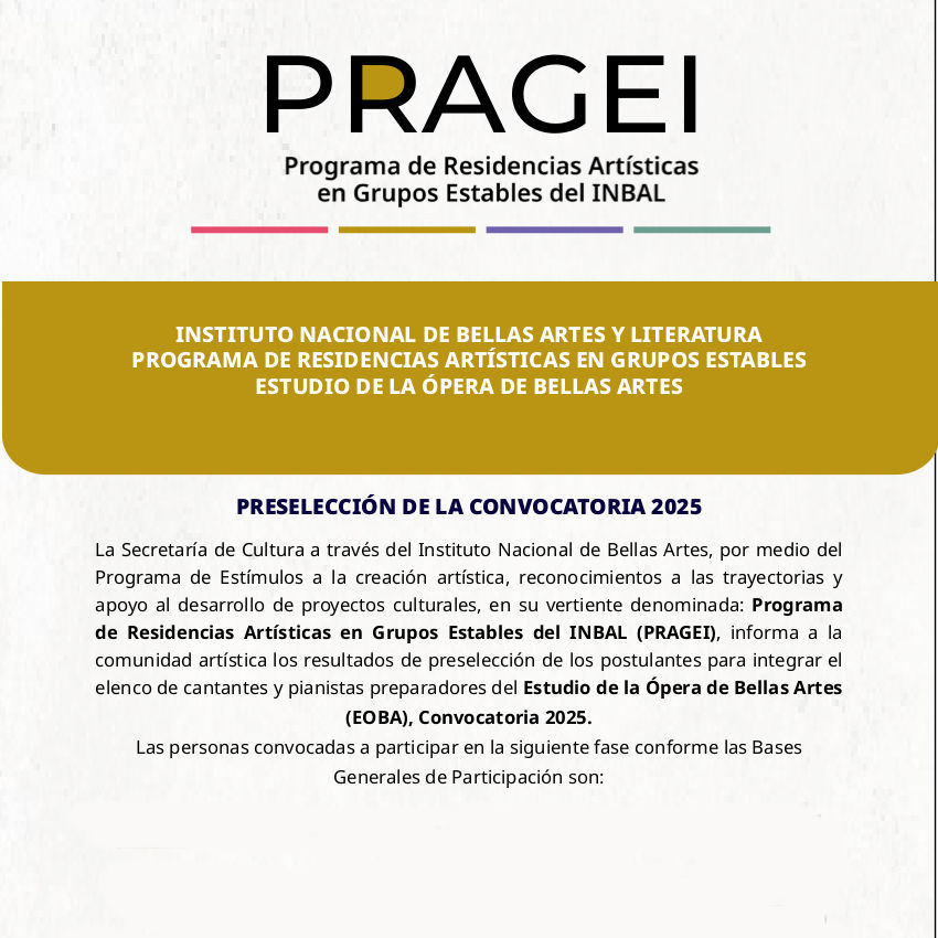 El Programa de Residencias Artísticas de Grupos Estables del INBAL (PRAGEI) tiene como propósito el desarrollo profesional de los artistas escénicos a partir de su incorporación como residentes a uno de los cuatro Grupos Estables del INBAL: Compañía Nacional de Teatro (CNT), Centro de Experimentación y Producción de Música Contemporánea (Cepromusic), Centro de Producción de Danza Contemporánea (Ceprodac) y el Estudio de la Ópera de Bellas Artes (EOBA). Estas residencias son de carácter nacional y se integrarán a través de convocatorias públicas.