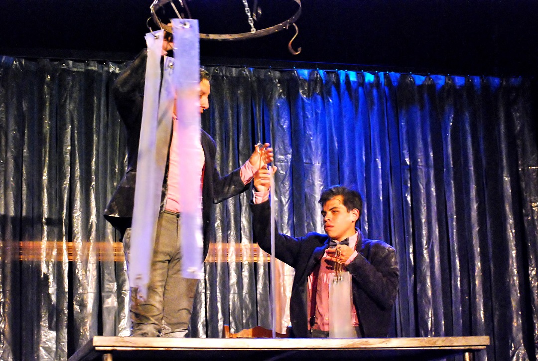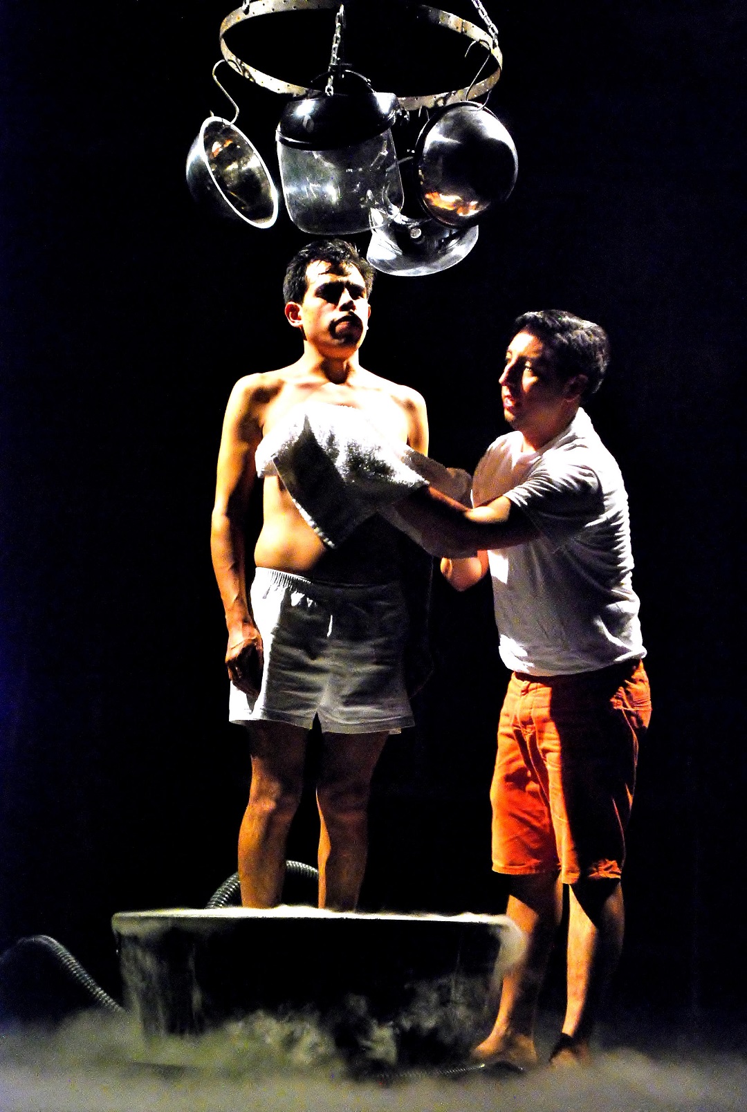 La obra inicia con la limpieza que hacen los hermanos en la cocina, acción que se vislumbra a través de las tiras de una cortina de plástico, ambos están vestidos exactamente igual.