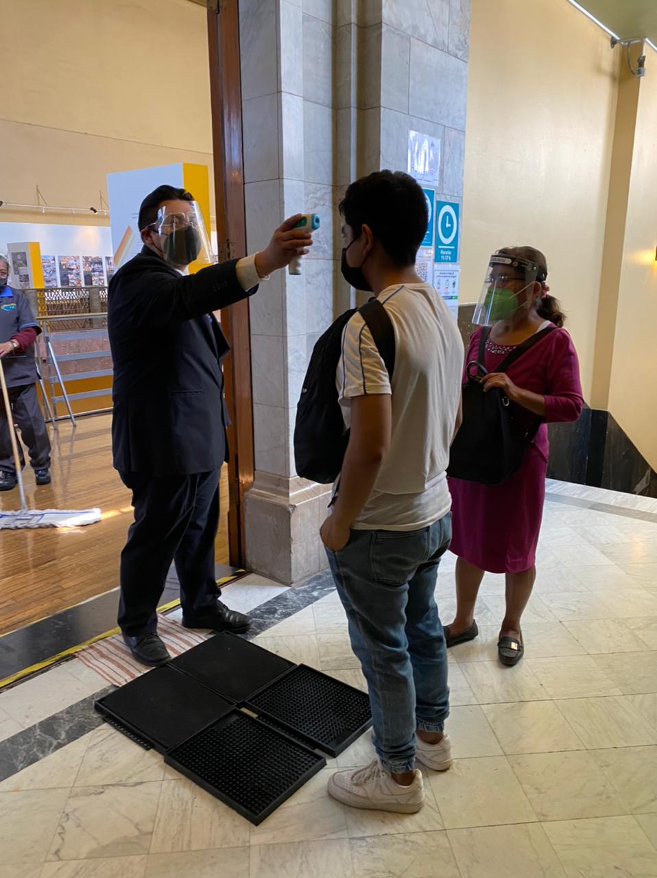 En el Munarq el personal encargado de recibir a los visitantes está preparado para orientarlos durante su visita, desde la llegada a través de un filtro sanitario en el cual se les toma la temperatura, se les aplica gel antibacterial y se les desinfecta el calzado en un tapete con una solución salina.