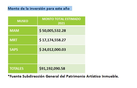 En el caso del MAM, con casi 57 años sin algún acondicionamiento o modernización significativa en su infraestructura, recibirá una atención integral de espacios exteriores e interiores para un mejor aprovechamiento de sus proyectos expositivos y atención a públicos. Entre las mejoras al recinto se atiende el mantenimiento y rehabilitación de los domos de fibra de vidrio, la atención del equipamiento de seguridad y conservación, la adecuación y rehabilitación de áreas públicas y laborales del recinto para su óptimo aprovechamiento, la rehabilitación de los exteriores, incluyendo áreas verdes y las obras que conforman su JardÃn Escultórico, el cual será de libre acceso a partir de que concluyan las adecuaciones.