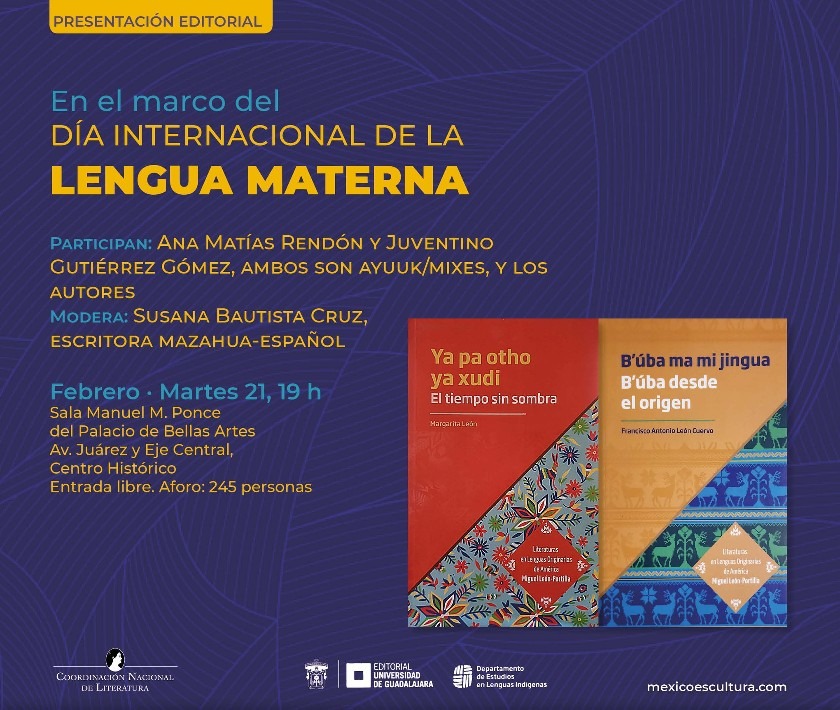 El martes 21 de febrero a las 19:00 horas se realizarán, en la Sala Manuel M. Ponce del Palacio de Bellas Artes, las presentaciones editoriales de B’úba ma mi jingua / B’úba desde el origen, del narrador, poeta y profesor mazahua Francisco Antonio León Cuervo, y Ya pa otho ya xudi / El tiempo sin sombra, de la poeta Margarita León, quienes serán acompañados por Ana MatÃas Rendón y Juventino Gutiérrez Gómez, ambos Ayuuk/mixes; la escritora en mazahua, Susana Bautista Cruz, será la encargada de moderar la presentación.