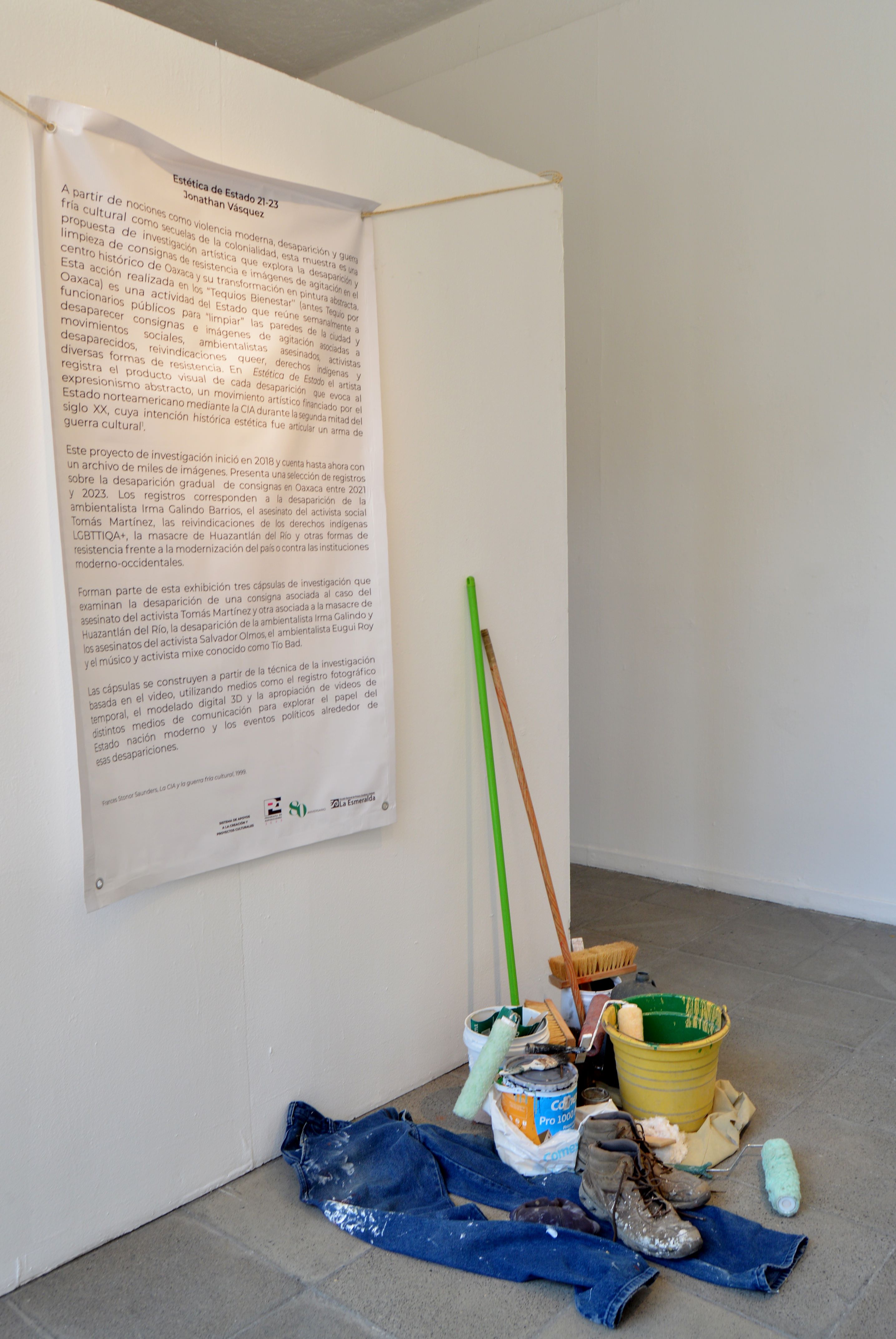 La muestra forma parte del Programa de Exposiciones 2023 y se inserta en las actividades por el 80 aniversario de La Esmeralda. Presenta una selección del trabajo que Jonathan Vásquez inició a partir de 2018 y que incluye piezas del presente año; una investigación que explora la limpieza y desaparición de consignas e imágenes de movimientos sociales y artísticos en el Centro Histórico de Oaxaca.