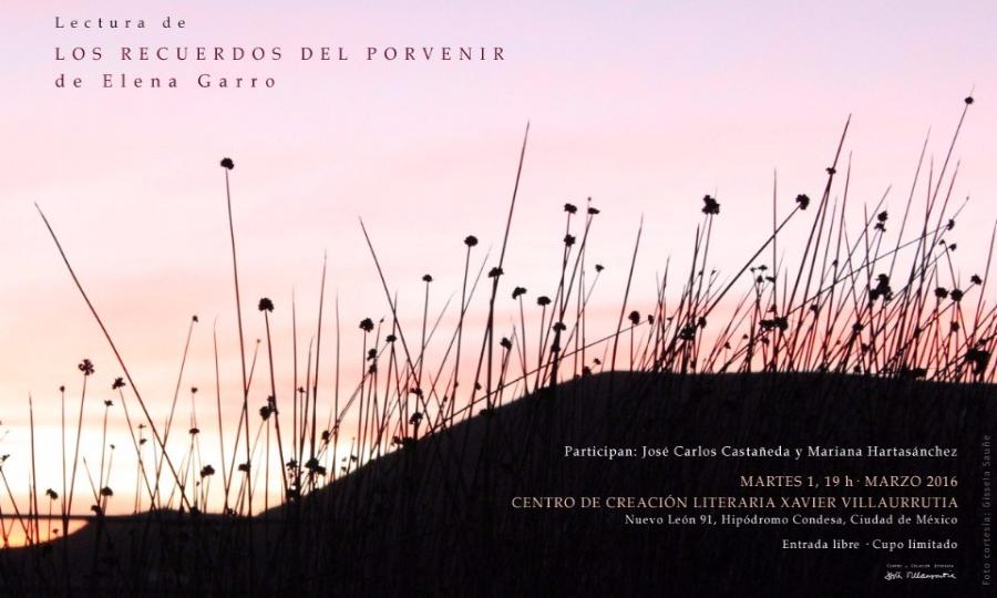 La lectura en voz alta de fragmentos de Los recuerdos del porvenir de Elena Garro, como parte de las celebraciones del Día Internacional de la Mujer, y como festejo de una destacada obra literaria que mereció el Premio Xavier Villaurrutia 1963, se hará por parte de la actriz Mariana Hartasánchez, quien estará acompañada por José Carlos Castañeda, experto en la obra de la autora poblana, el martes 1 de marzo a las 19:00 en el Centro de Creación Literaria Xavier Villaurrutia, ubicado en avenida Nuevo León 91, colonia Hipódromo Condesa. La entrada será gratuita.