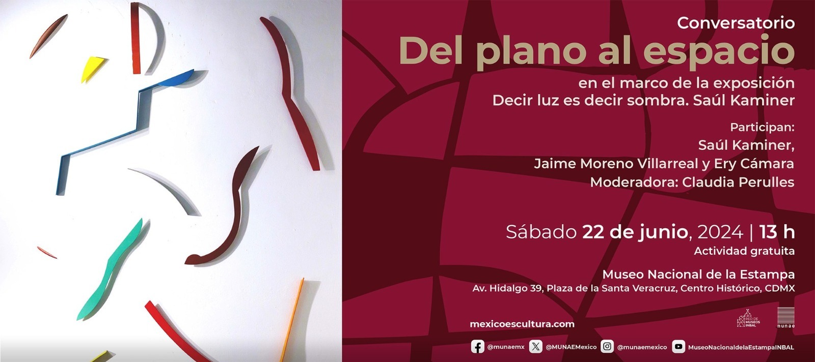 En el marco de la exposición Decir luz es decir sombra. Saúl Kaminer, que se presenta en el Museo Nacional de la Estampa (Munae), se llevará a cabo el conversatorio Del plano al espacio, en el que los especialistas Jaime Moreno Villarreal, Ery Cámara, el expositor Saúl Kaminer y Claudia Perulles, como moderadora, abordarán la relación del artista con los distintos movimientos y creadores con los que ha interactuado a lo largo de su trayectoria.