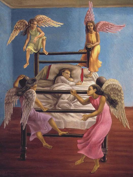 En el cuarto núcleo, Ángeles alegóricos, se pueden ver obras más contemporáneas, donde los artistas rompen con las características estereotipadas de los ángeles y brindan una interpretación diferente. “Por ejemplo, ya se les asigna un sexo, y algunos tienen tez morena, como se puede apreciar en la obra Cuatro esquinitas tiene mi cama, de Juan Soriano, donde se observan cuatro ángeles (mujeres) custodiando el sueño de la persona que duerme”.