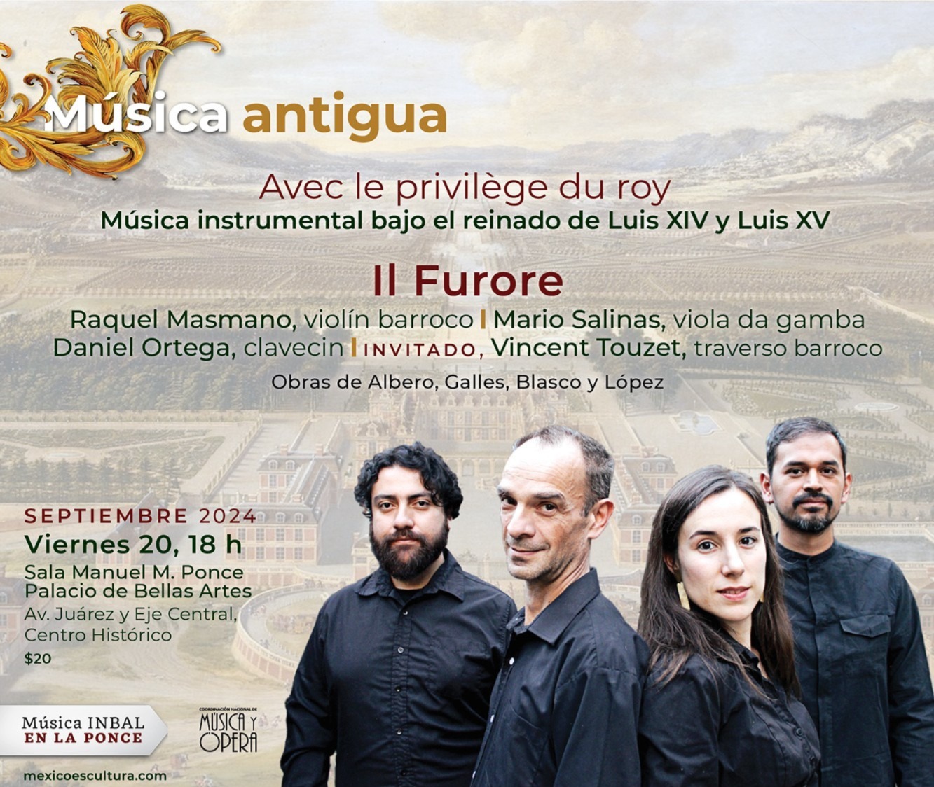 Con lo mejor del repertorio barroco francés, el ensamble hispano-mexicano Il Furore presentará el concierto Avec le privilège du Roy. Música instrumental bajo el reinado de Luis XIV y Luis XV; viernes 20 de septiembre, a las 18:00 h, en la Sala Manuel M. Ponce del Palacio de Bellas Artes.