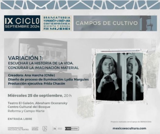 El miércoles 25 de septiembre, a las 20:00 h, se llevará a cabo Campo de cultivo, variación 1: Escuchar la historia de la vida, conjurar la imaginación material, con la creadora chilena Ana Harcha. Ella escenificará su diálogo a partir de las preguntas: ¿Qué escucho de las voces de la vida-muerte?, ¿qué materias hablan conmigo, a cuáles escucho?, ¿cómo los modos de uso transforman, resisten o revolucionan lo cotidiano, la información, lo dado, en experiencia?, ¿cómo se crea tiempo para escuchar y conjurar la imaginación material?