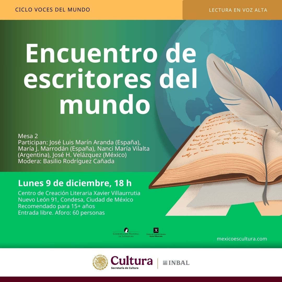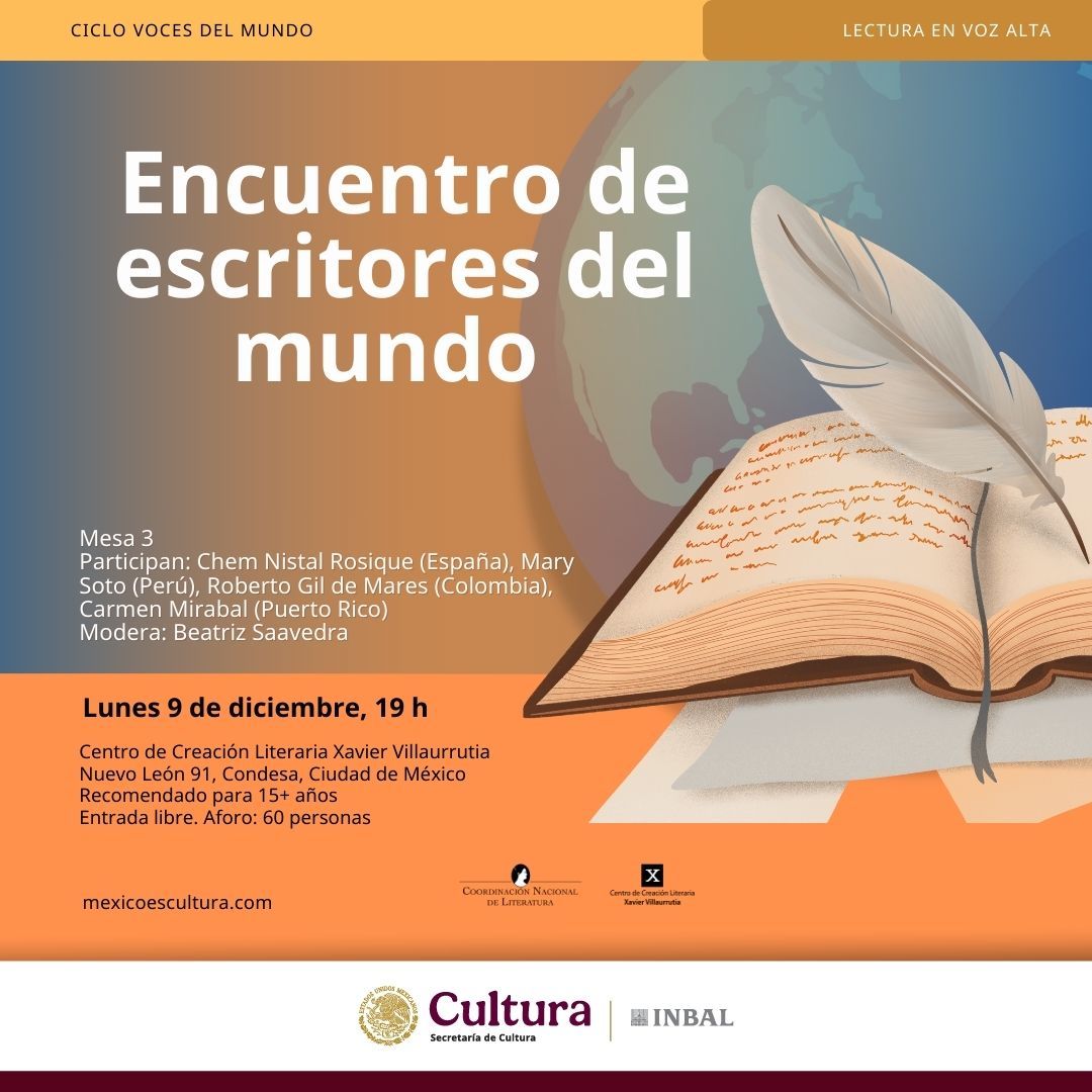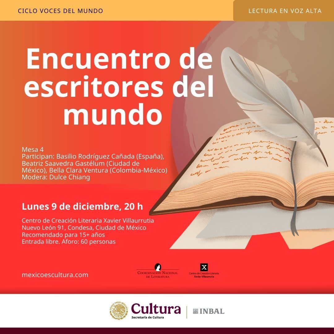 Como parte del Ciclo Voces del Mundo, la Secretaría de Cultura del Gobierno de México y el Instituto Nacional de Bellas Artes y Literatura (INBAL), a través de la Coordinación Nacional de Literatura (CNL), llevarán a cabo el Encuentro de escritores del mundo, donde el público podrá conocer la obra y experiencia de 13 escritoras y escritores de ocho países. La actividad se realizará el lunes 9 de diciembre en el Centro de Creación Literaria Xavier Villaurrutia (CCLXV), de las 17 a las 21 h.