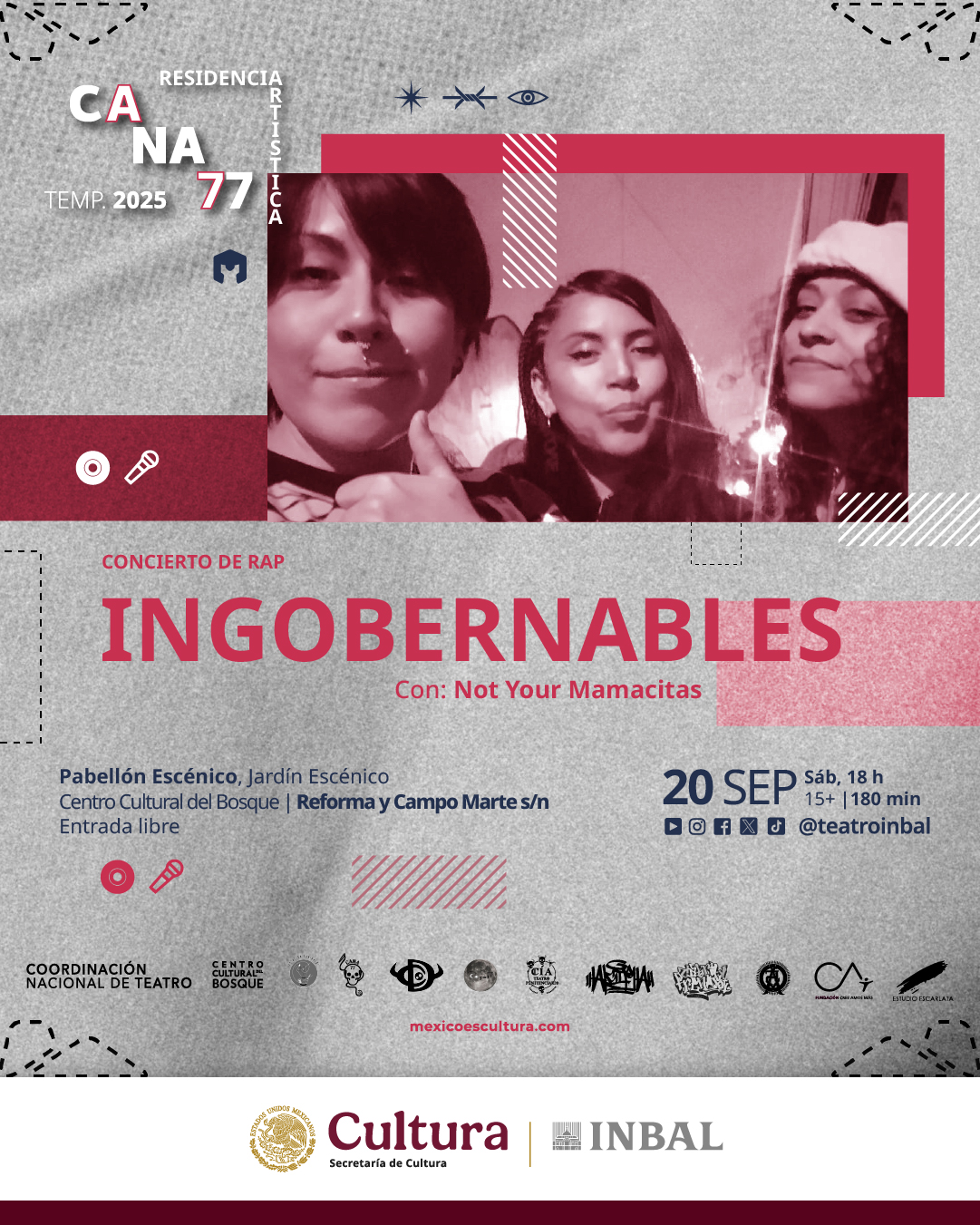 La Residencia continuará el sábado 20 de septiembre a las 18 horas con Ingobernables, concierto de rap a cargo del colectivo Not Your Mamacitas, integrado por Akira, Cabra Frenesí y XibAkbal, que celebra la resistencia femenina.