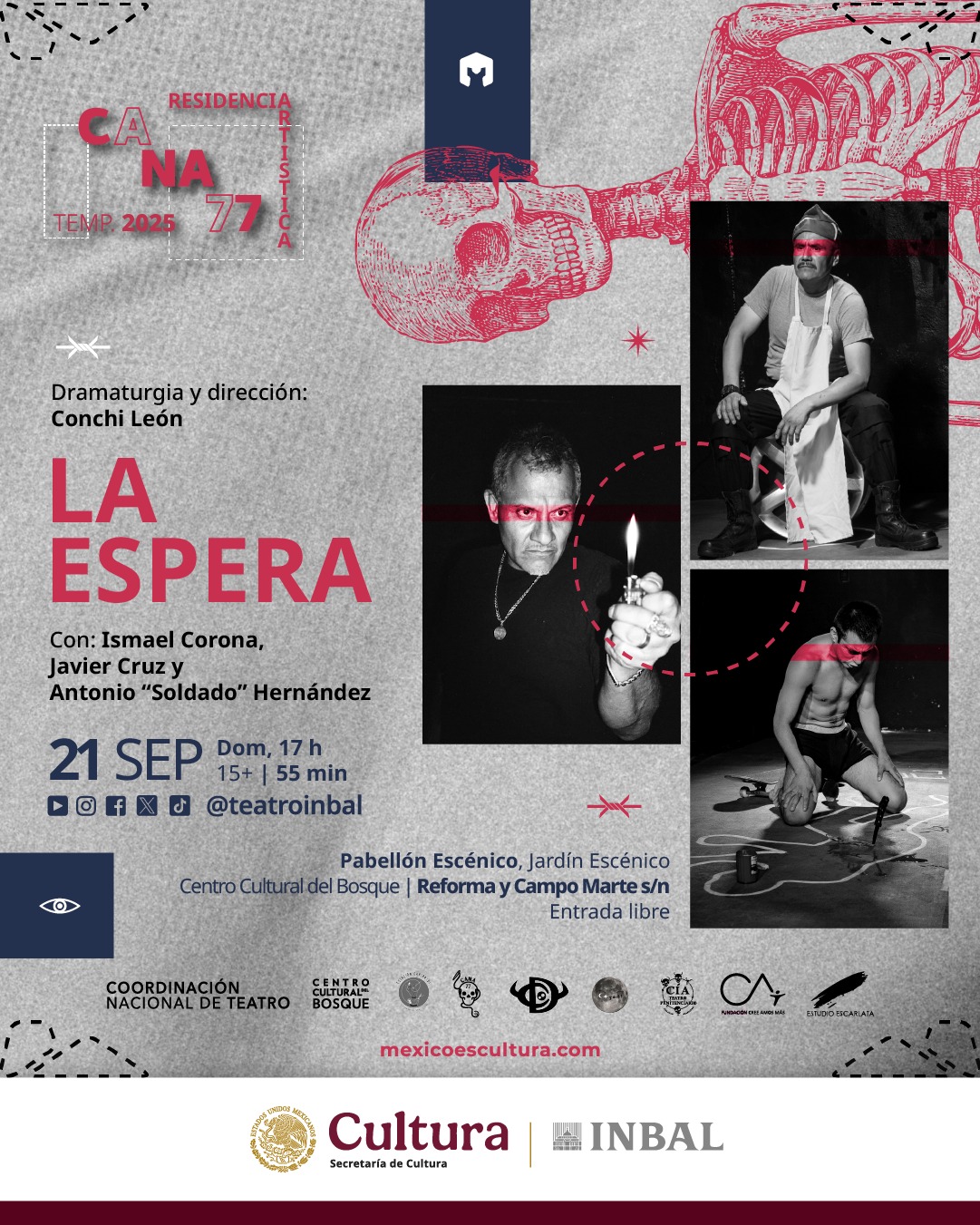 La Espera es un juego escénico que oscila entre la realidad y la ficción, surgido del trabajo que la dramaturga realizó con personas privadas de la libertad. “Cada relato es un monólogo que se entrelaza para narrar las historias de cuatro hombres antes, durante y después de estar en prisión, dos de ellos por más de 20 años. Esta obra contribuye a combatir prejuicios y estereotipos alrededor de las personas privadas de su libertad; es una ventana hacia las cárceles mexicanas vistas como un lugar con sus propias reglas, tiranos y formas de sobrevivencia”, comparte la autora y directora.