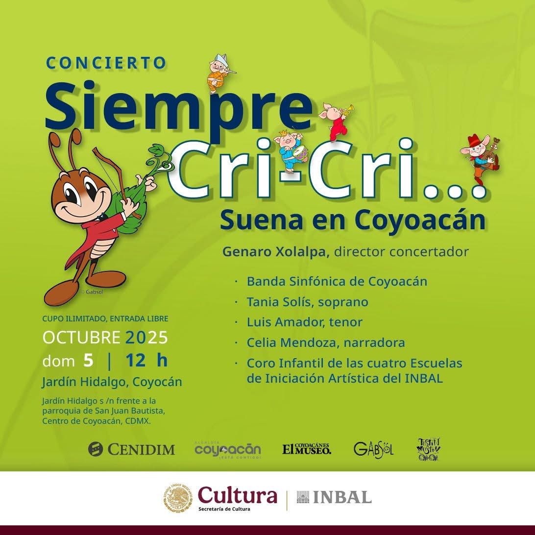 El Instituto Nacional de Bellas Artes y Literatura (INBAL), a través de la Subdirección General de Educación e Investigación Artísticas (SGEIA), por medio de sus Escuelas de Iniciación Artística y del Centro Nacional de Investigación, Documentación e Información Musical “Carlos Chávez” (CENIDIM), invita al concierto Siempre Cri-Cri… Suena en Coyoacán, que se llevará a cabo frente a la parroquia de San Juan Bautista, en el corazón de Coyoacán.