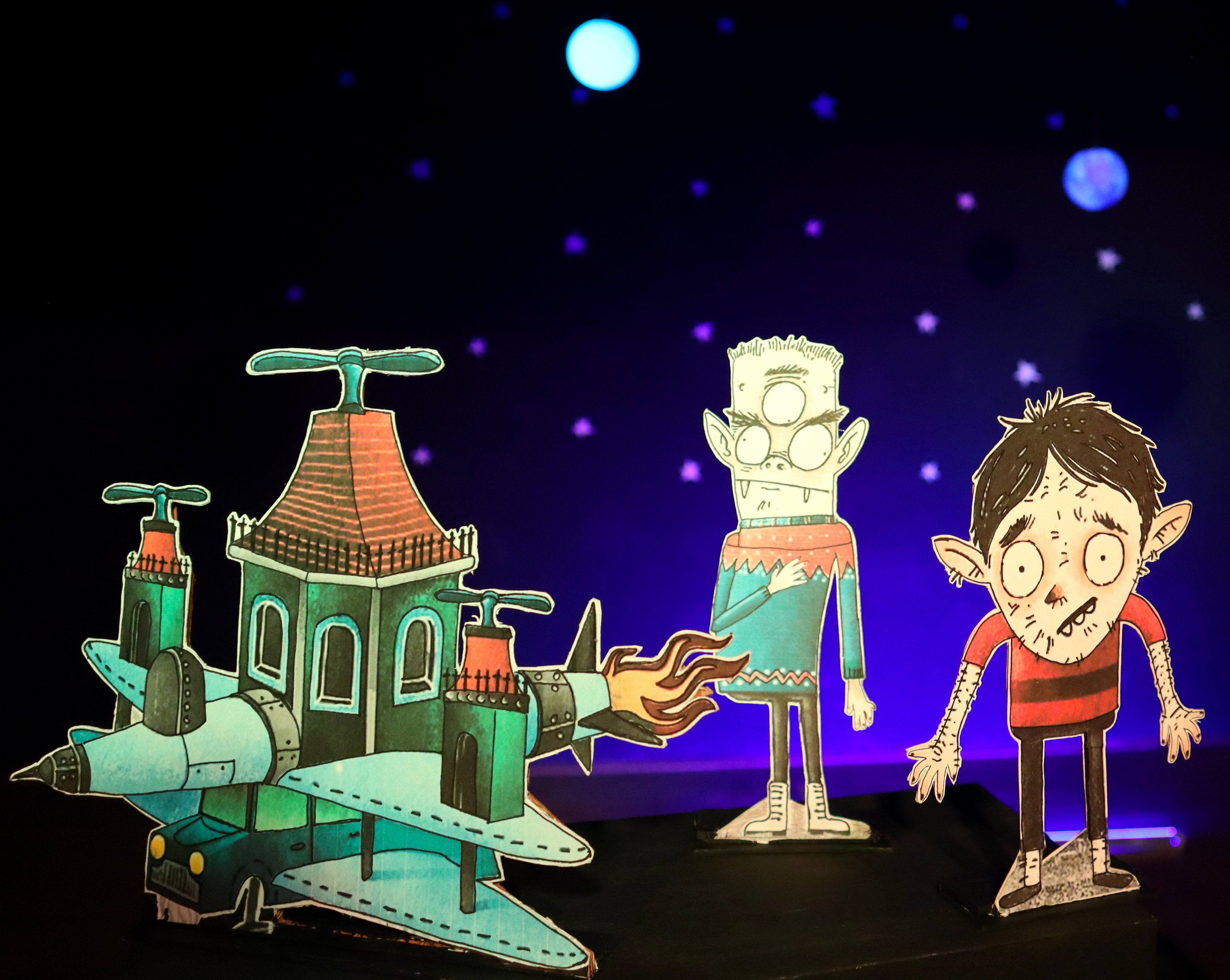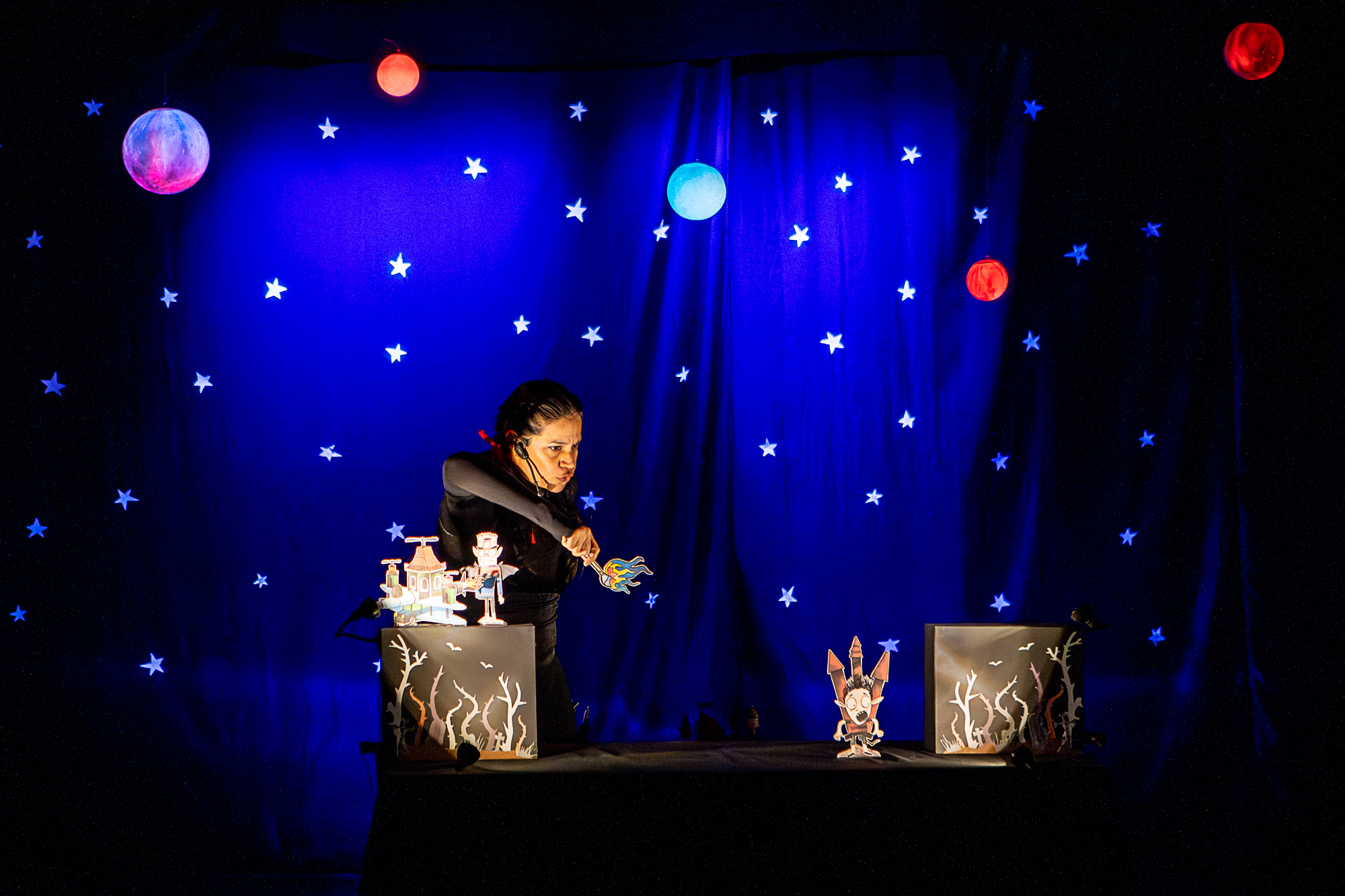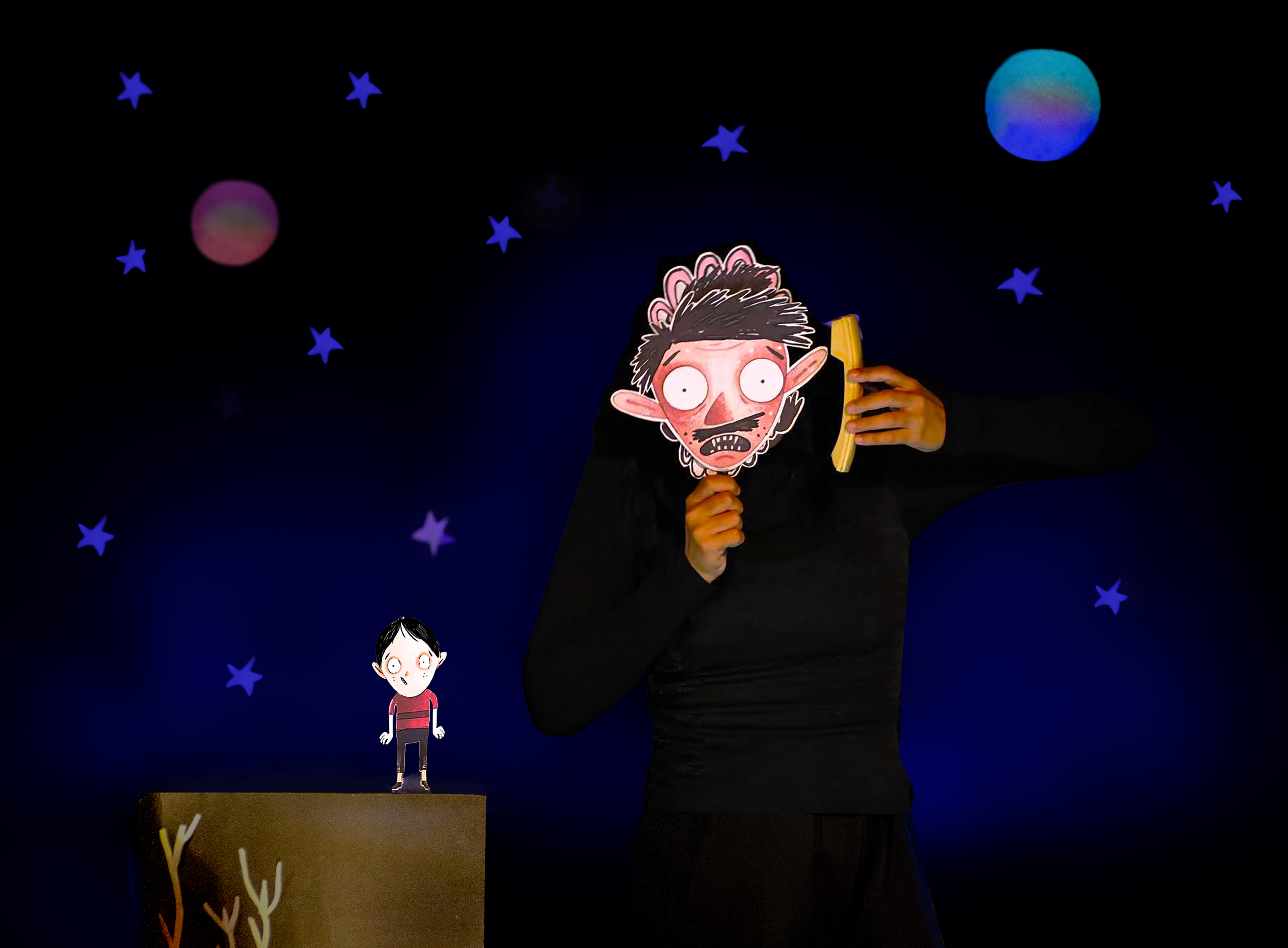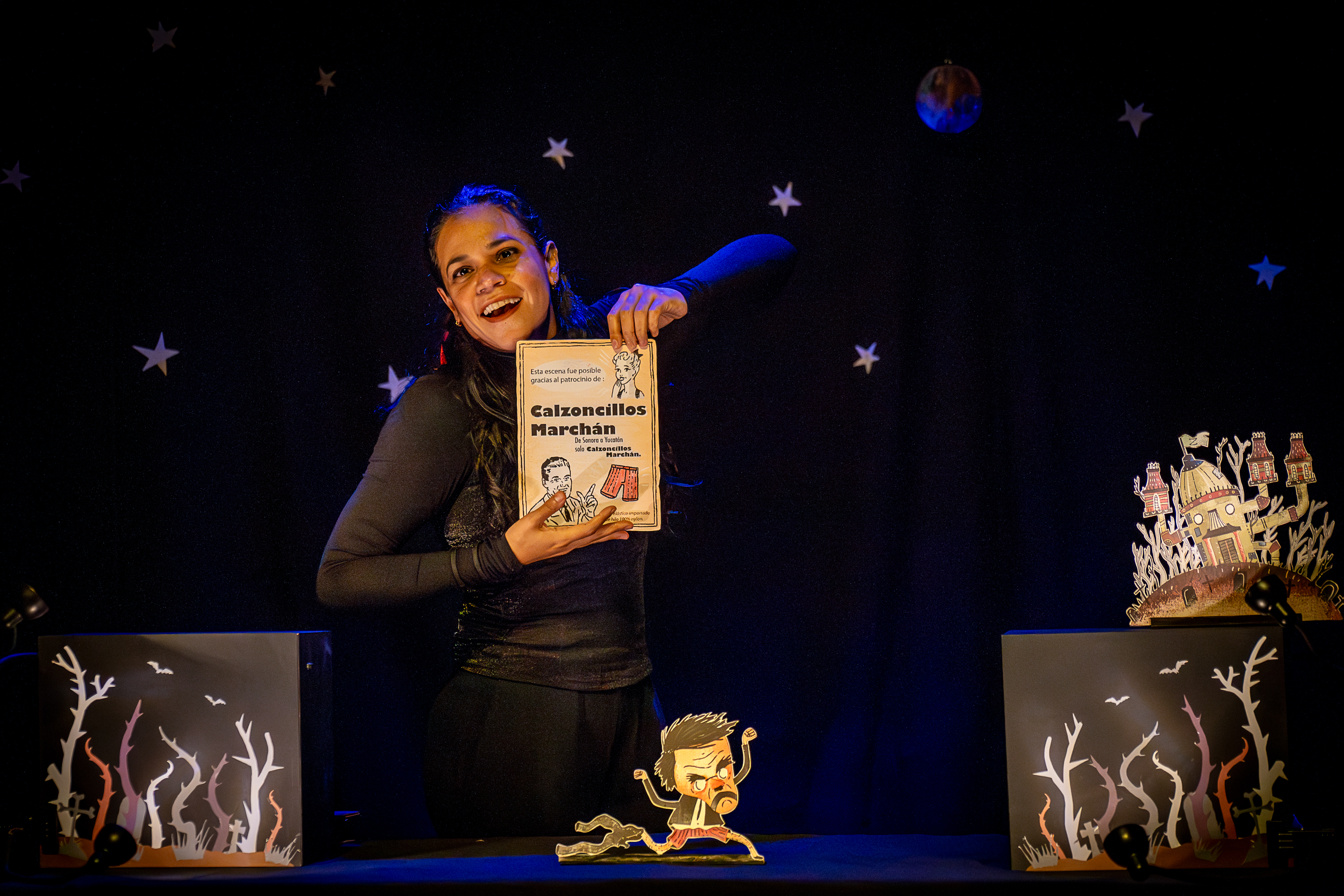 El montaje combina la manipulación de títeres bidimensionales, ilustración y actuación, generando un universo visual dinámico. Los escenarios desplegables y los personajes de cartón se transforman con la acción, mientras la actriz titiritera narra, interpreta y manipula en escena, creando una experiencia íntima y artesanal que despierta el asombro.