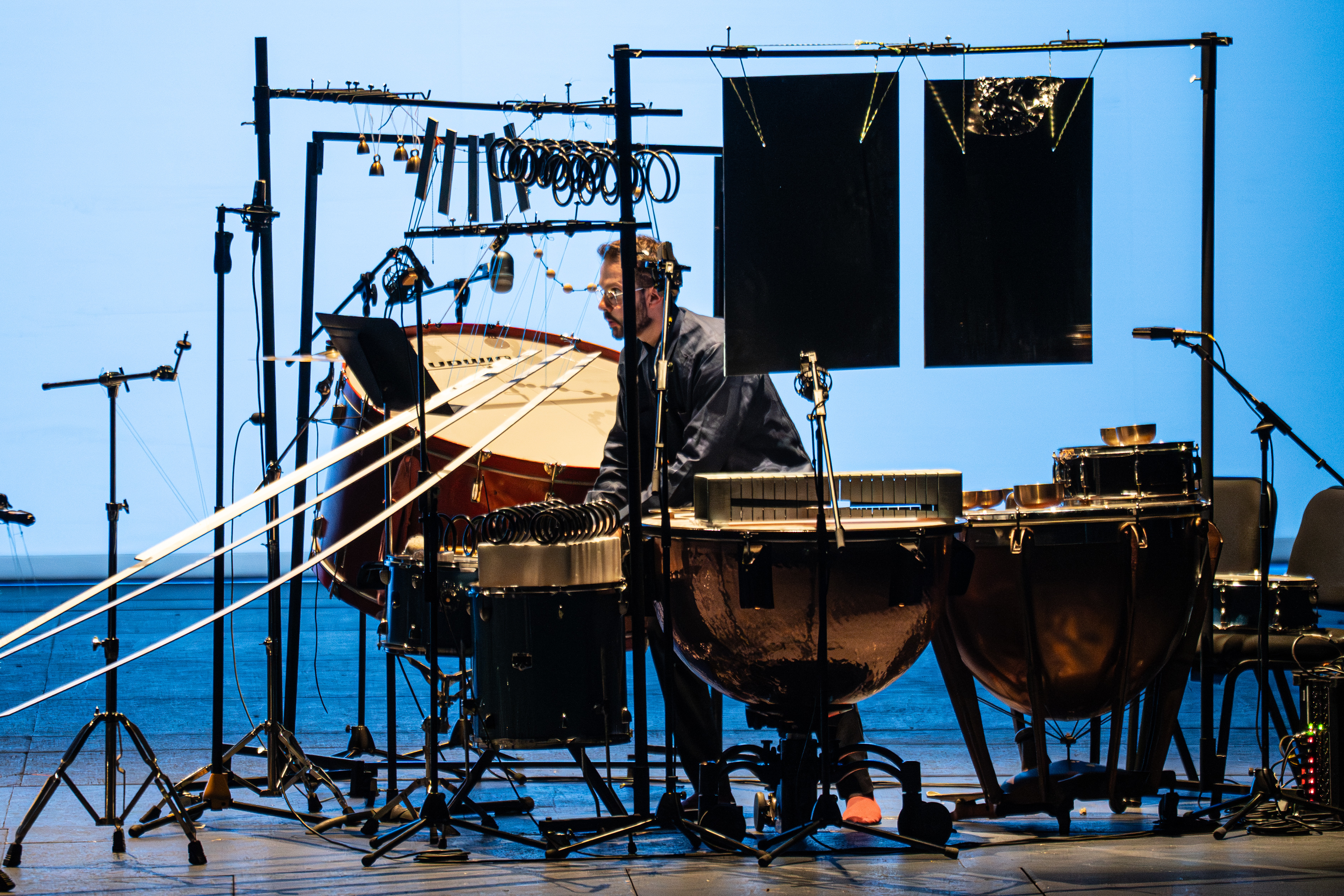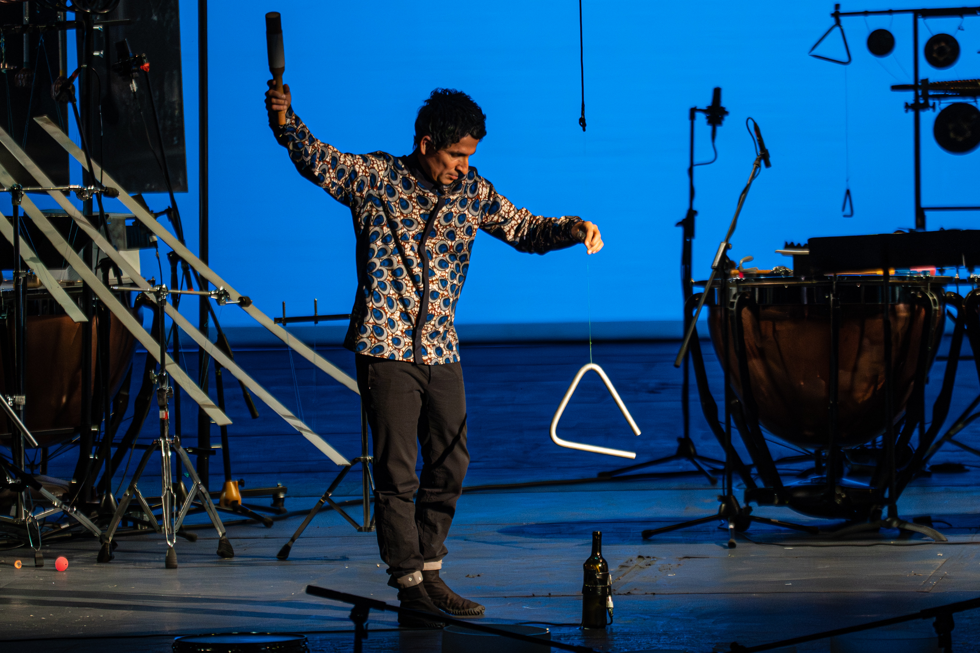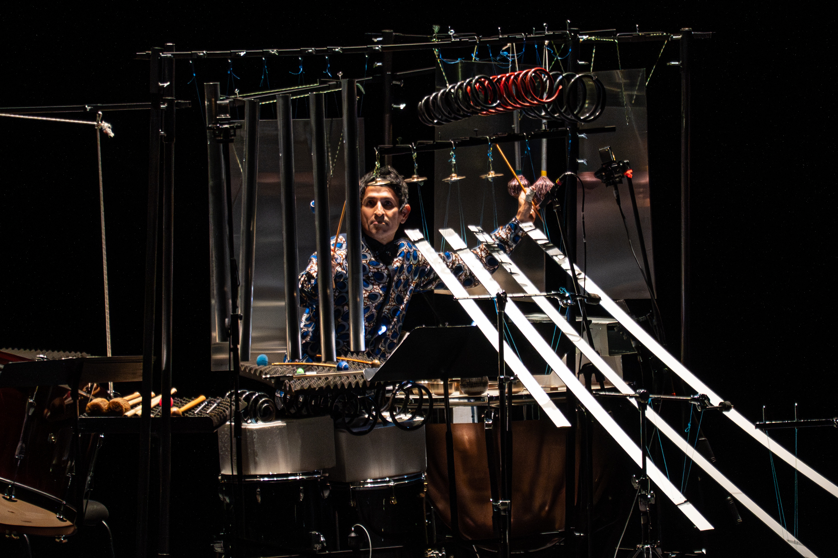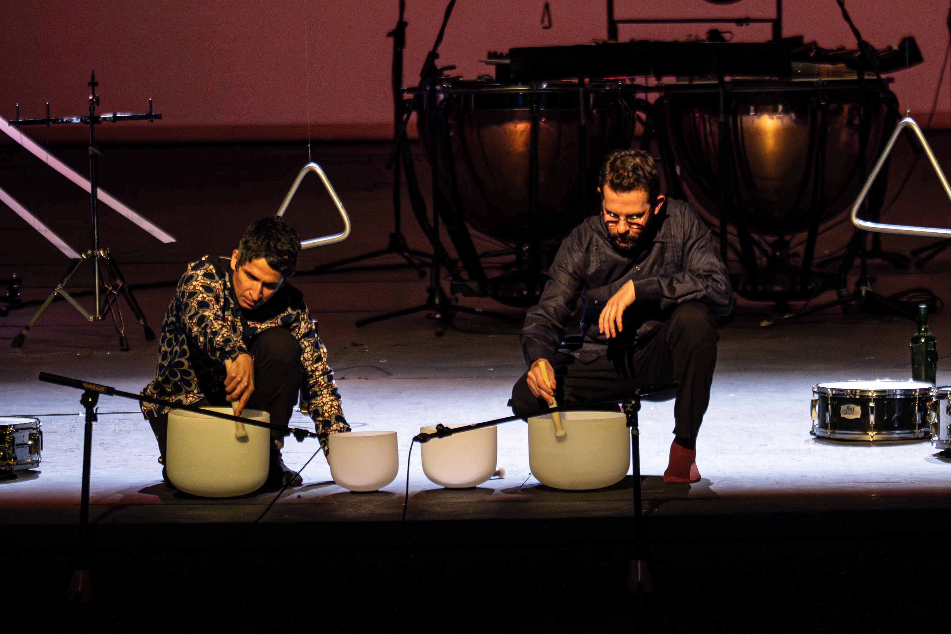 La versión para dos percusionistas mantuvo al público atento a cada exploración del sonido, que se realizó también con objetos e instrumentos desplegados en el escenario: tambores, estructuras metálicas, cuencos y tarolas de batería, para que los sonidos adquirieran forma, peso y textura durante la interpretación.