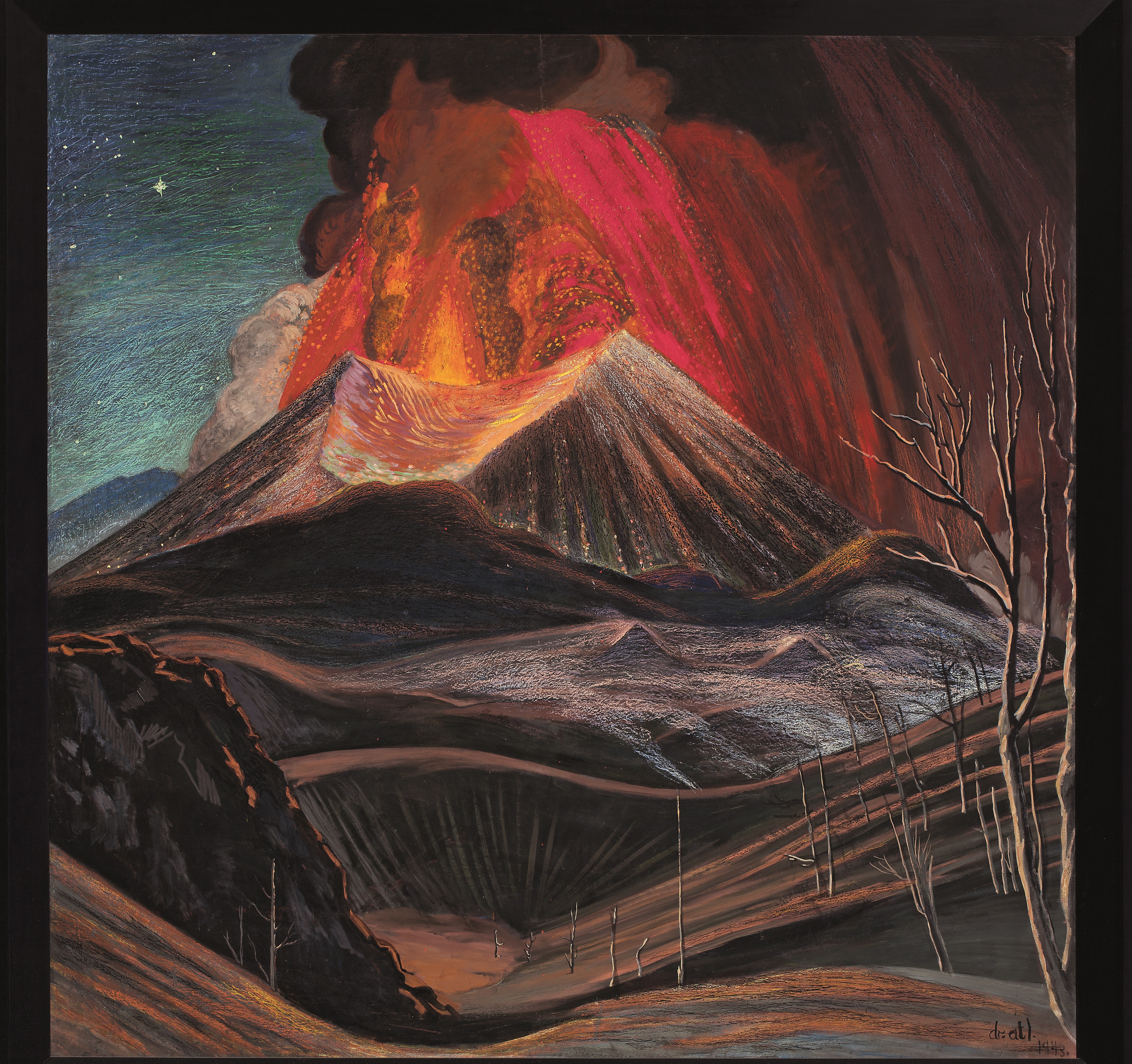 De inicios del siglo XX, el MUNAL posee piezas de una serie única en el mundo realizada por Gerardo Murillo “Dr. Atl”: Erupción del Paricutín (1943), cuyos elementos la convierten en una imagen singular dentro del contexto de las vanguardias latinoamericanas e internacionales. “El uso de colores saturados y brillantes expresa la energía de la lava y la fuerza de la tierra. El tratamiento de las pinceladas genera dinamismo y perspectiva, destacando la importancia de la obra”, comentó Martínez. Realizada con atl-color, esta pintura forma parte de una colección privilegiada que documenta el nacimiento del volcán michoacano y que el también vulcanólogo donó al entonces Museo Nacional de Artes Plásticas en 1950, integrada por 130 dibujos y 11 pinturas.