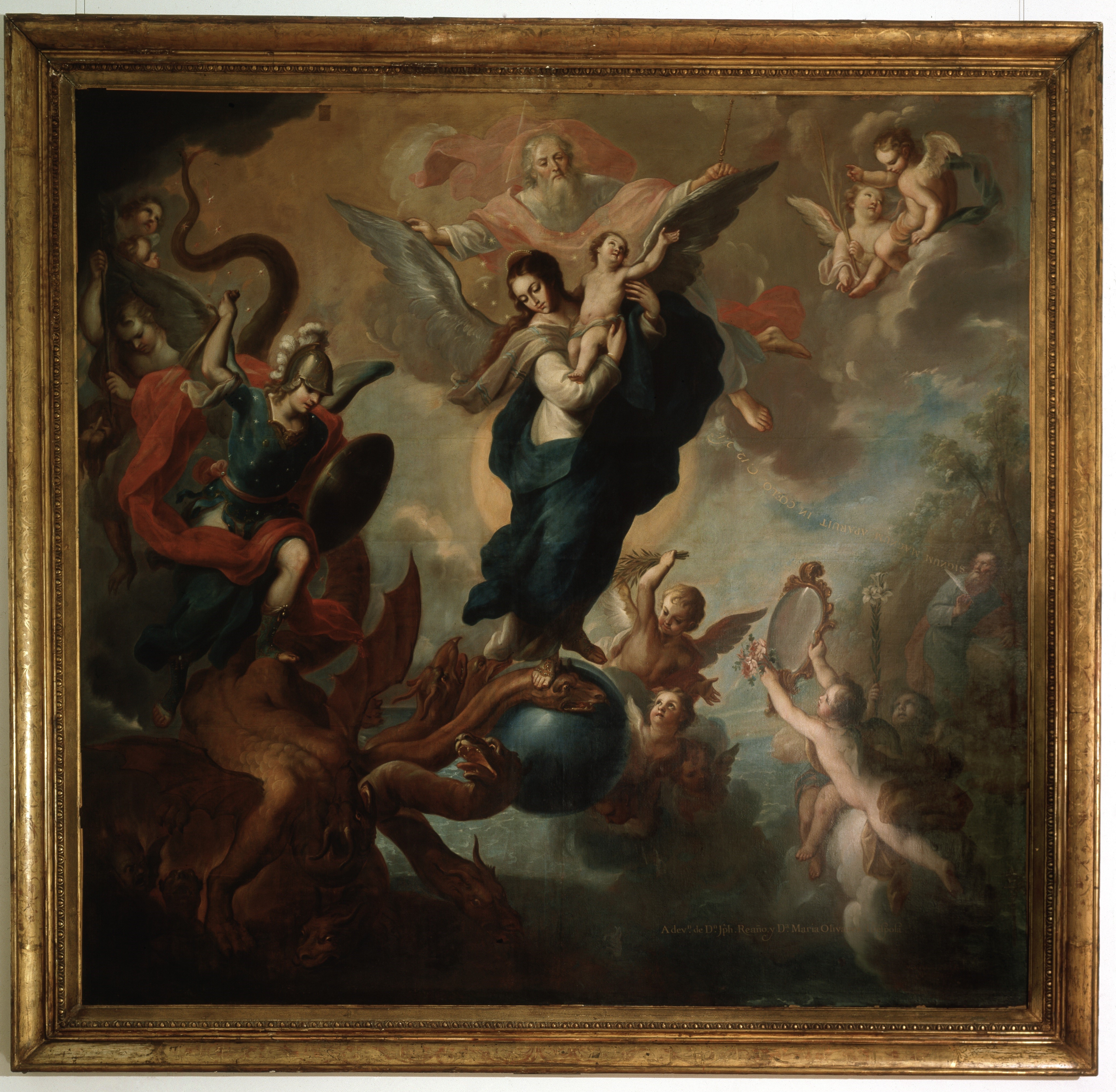 Del siglo XVIII se exhibe La Virgen del Apocalipsis (1760), de Miguel Cabrera, quien se consagró como uno de los pintores e intelectuales más destacados de su época. “La imagen representa un suceso del Antiguo Testamento y puede interpretarse como la personificación de la Iglesia. La Virgen es una Inmaculada Concepción que vence al mal, con un grado de movimiento notable. El uso de la luz y el color evidencia el excelente oficio del maestro”, detalló el curador.