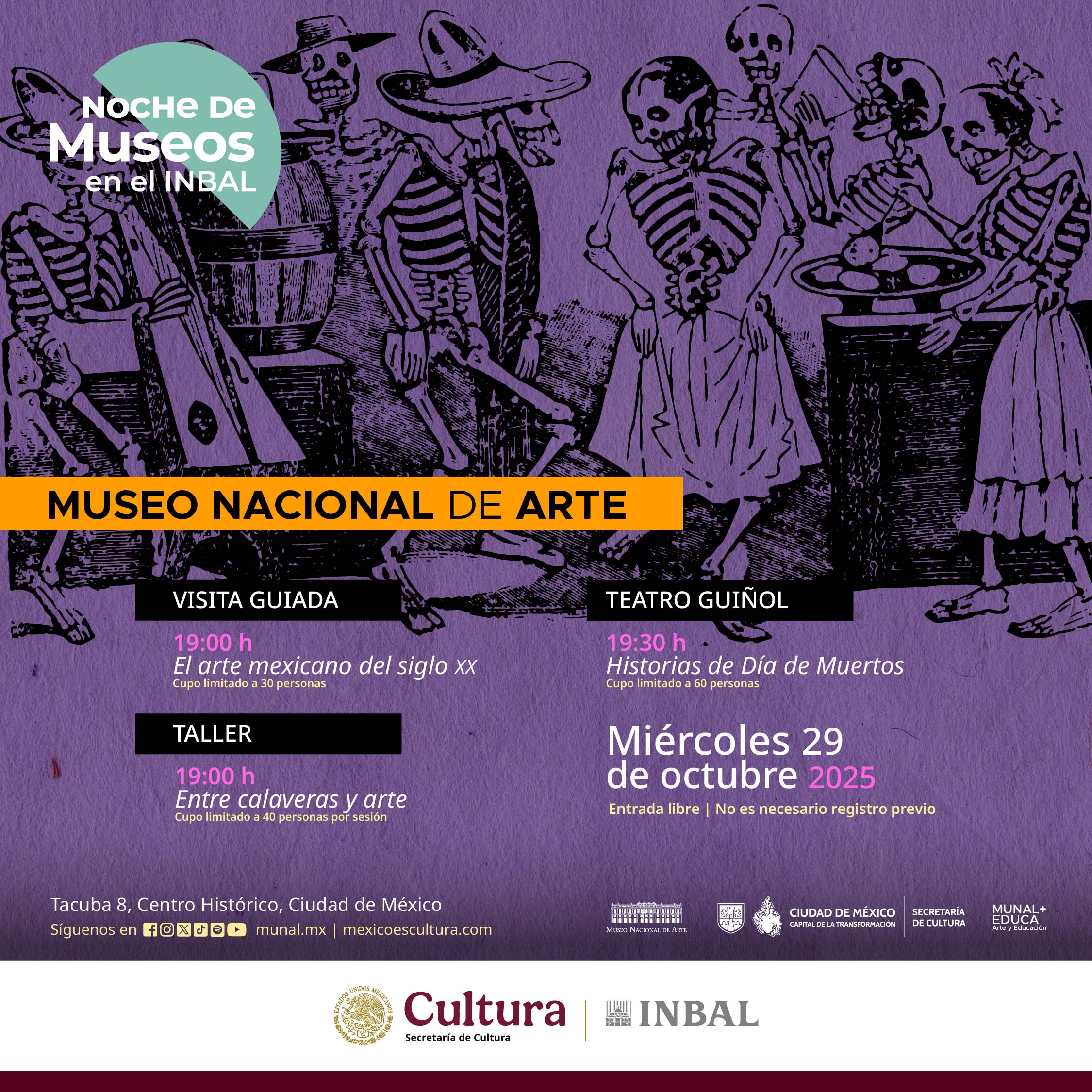El Museo Nacional de Arte (MUNAL) dedicará su altar del Día de Muertos a los artistas cuyas obras forman parte de la colección del museo. Además, durante la inauguración, el 29 de octubre a las 19:30 horas, en el contexto de la Noche de Museos, se realizará una instalación colectiva en la que los asistentes podrán dejar un mensaje a sus difuntos. La ofrenda se podrá visitar hasta el 2 de noviembre.
