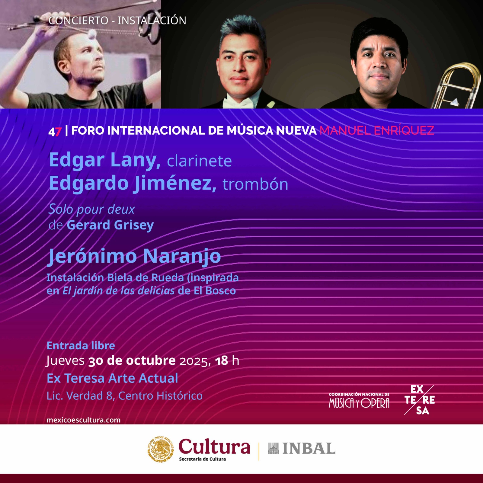 En Ex Teresa Arte Actual, recinto del Instituto Nacional de Bellas Artes y Literatura (INBAL), se llevará a cabo el estreno mundial de la instalación sonora Biela de rueda, inspirada en El Jardín de las Delicias de El Bosco, de Jerónimo Naranjo, así como el estreno en México de la obra Solo pour deux, de Gérard Grisey, el jueves 30 de octubre a las 18 horas, en el marco del 47 Foro Internacional de Música Nueva Manuel Enríquez (FIMNME).