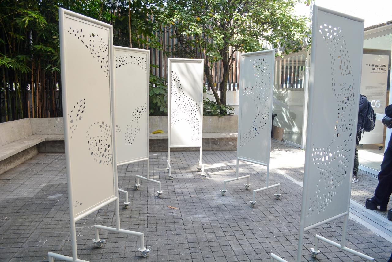 Por su parte, la instalación El aire en forma de huésped, de Cecilia Miranda Gómez, propone una reflexión sobre la respiración como punto de encuentro entre lo vivo y lo que no está. Como una alusión al mobiliario de salas de espera hospitalarias, la artista transforma superficies metálicas perforadas en una suerte de radiografía pulmonar que se extiende, en la que luz y sombra evocan el tránsito del aire.