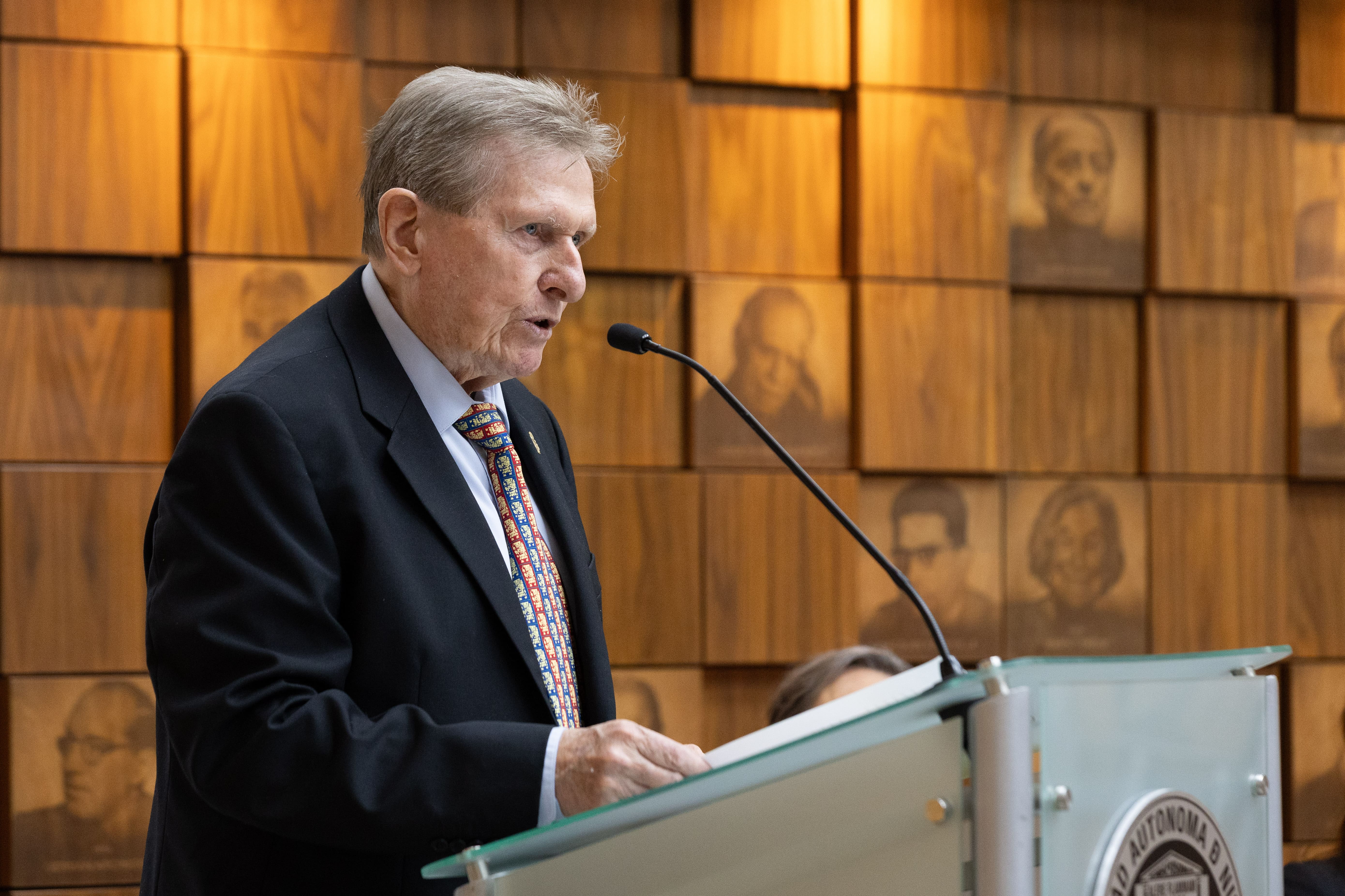 Durante el acto protocolario, el investigador y profesor recibió un reconocimiento, un estímulo económico de 300 mil pesos y una placa conmemorativa, la cual fue develada e integrada al muro de honor del vestíbulo principal de la Capilla Alfonsina.