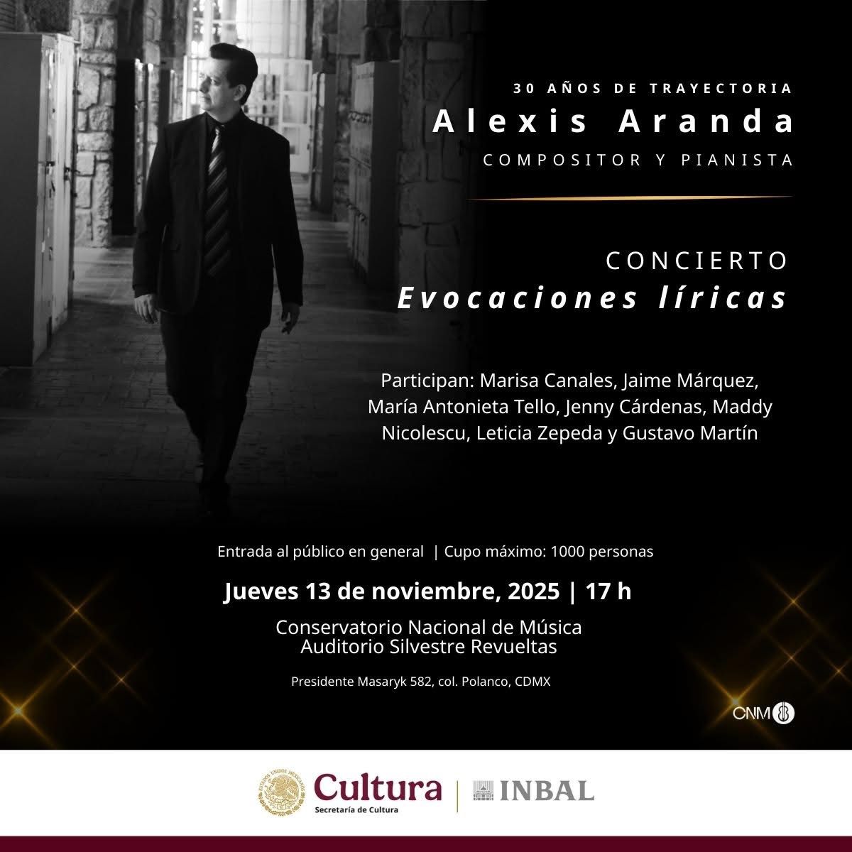 El Conservatorio Nacional de Música (CNM), adscrito a la Subdirección General de Educación e Investigación Artísticas (SGEIA) del Instituto Nacional de Bellas Artes y Literatura (INBAL), invita al concierto Evocaciones líricas, en celebración de los 30 años de trayectoria del compositor Alexis Aranda. La cita es el 13 de noviembre a las 17 horas en el Auditorio Silvestre Revueltas.
