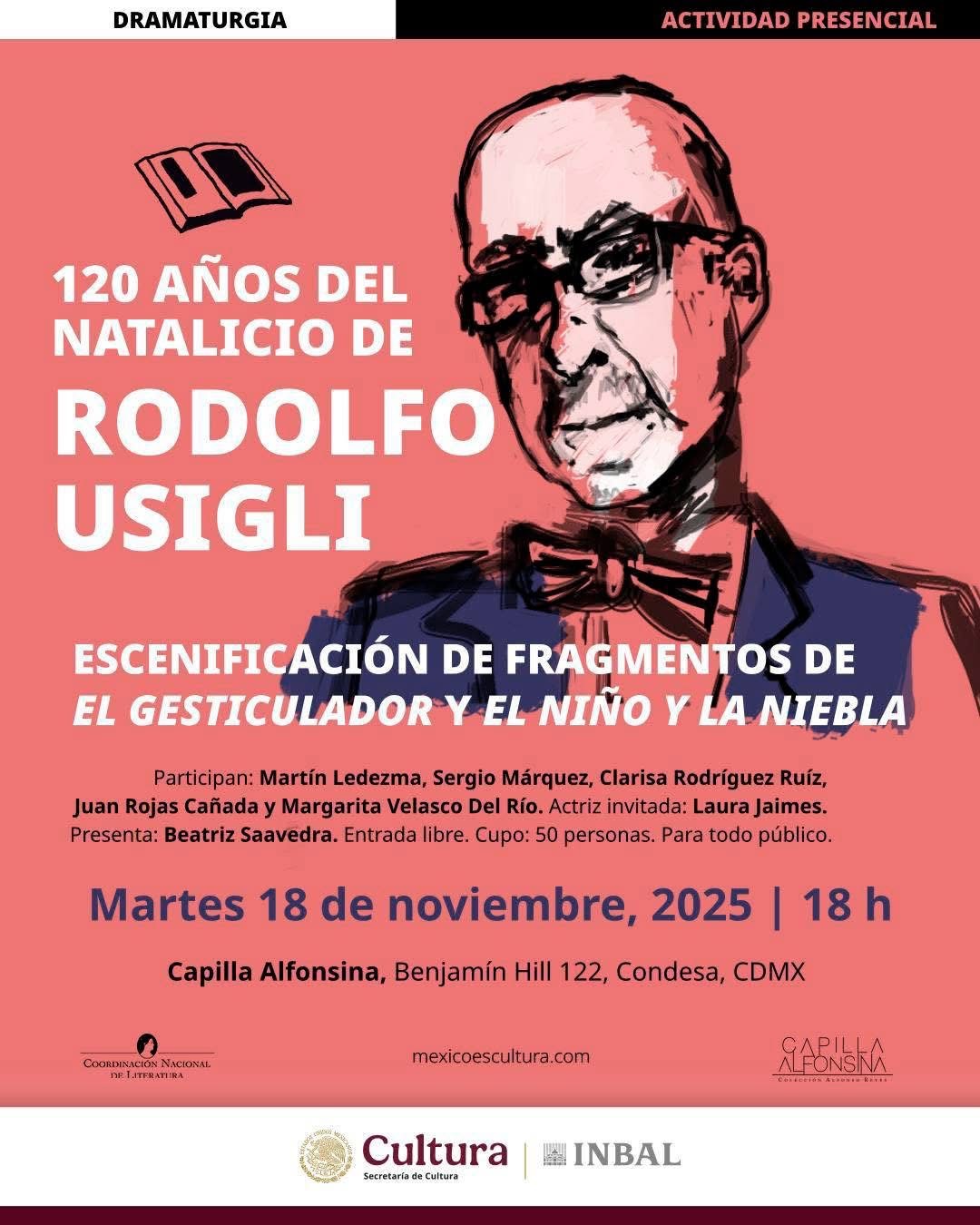 La Secretaría de Cultura del Gobierno de México y el Instituto Nacional de Bellas Artes y Literatura (INBAL), a través de la Coordinación Nacional de Literatura y la Capilla Alfonsina, presentan la actividad presencial Recordando al dramaturgo Rodolfo Usigli, en el marco de los 120 años de su natalicio. Se trata de una sesión dedicada a revisitar la obra, vida y legado de una de las figuras más relevantes del teatro mexicano.