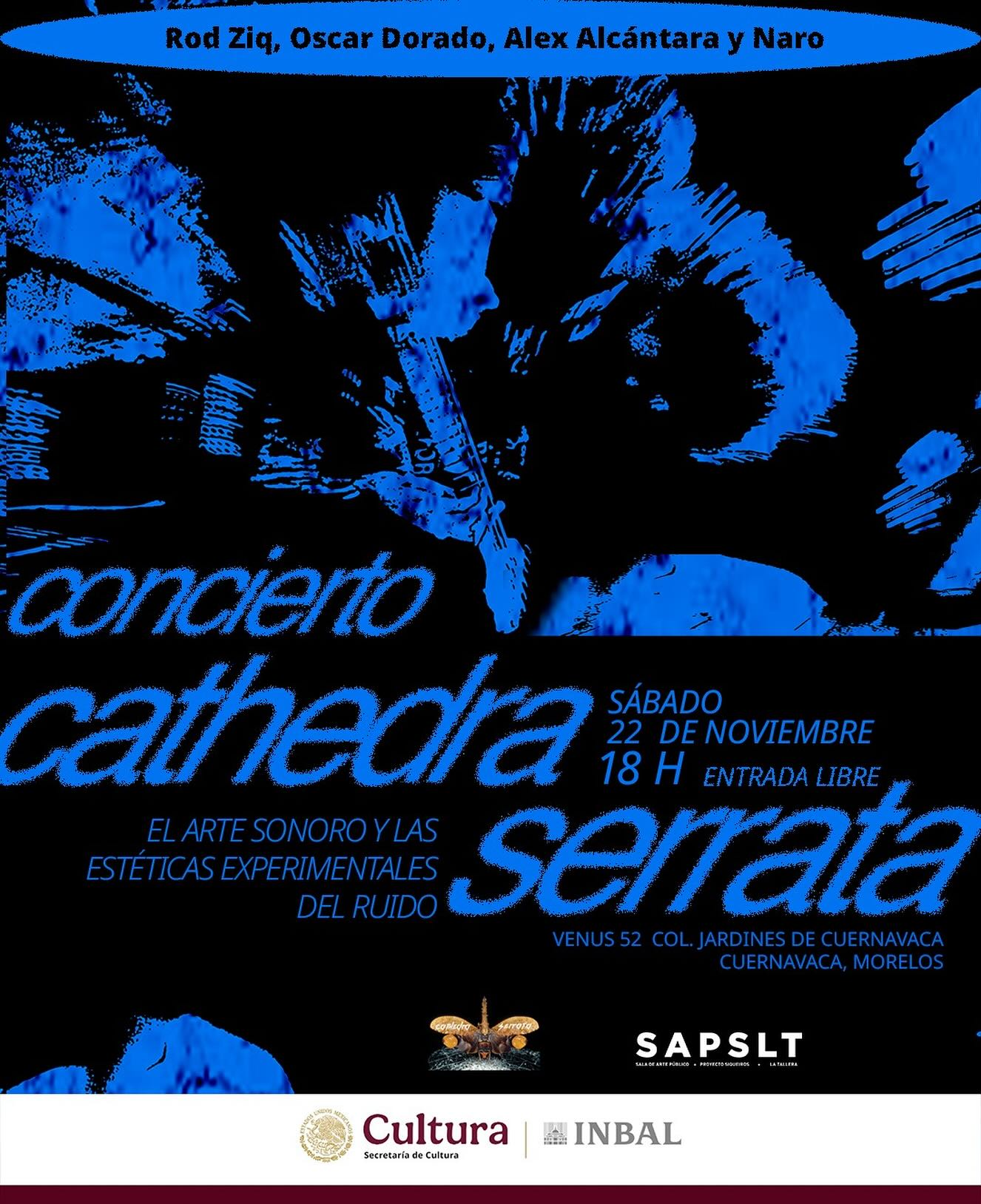 En La Tallera, espacio del Instituto Nacional de Bellas Artes y Literatura (INBAL) ubicado en la ciudad de Cuernavaca, Morelos, se llevará a cabo el concierto El arte sonoro y las estéticas experimentales del ruido, a cargo de Cathedra Serrata, el sábado 22 de noviembre a las 18 horas. La entrada es libre.
