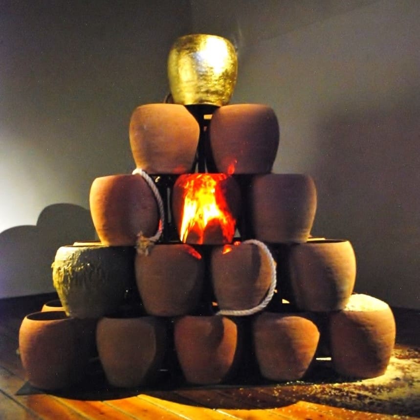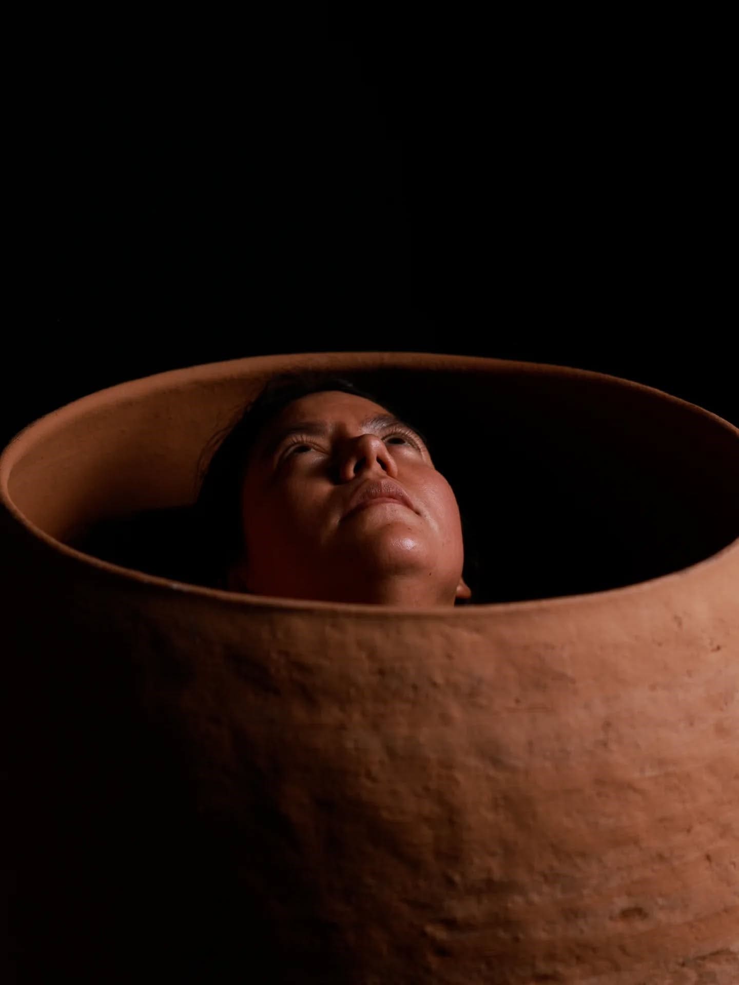 Asimismo, presenta Gabiá, instalación multimedia compuesta por 45 ollas de barro apiladas como pirámide, sobre las cuales se proyecta un video de fuego vivo, en diálogo con serigrafías que profundizan en la relación entre oficio, tecnología y materialidad.