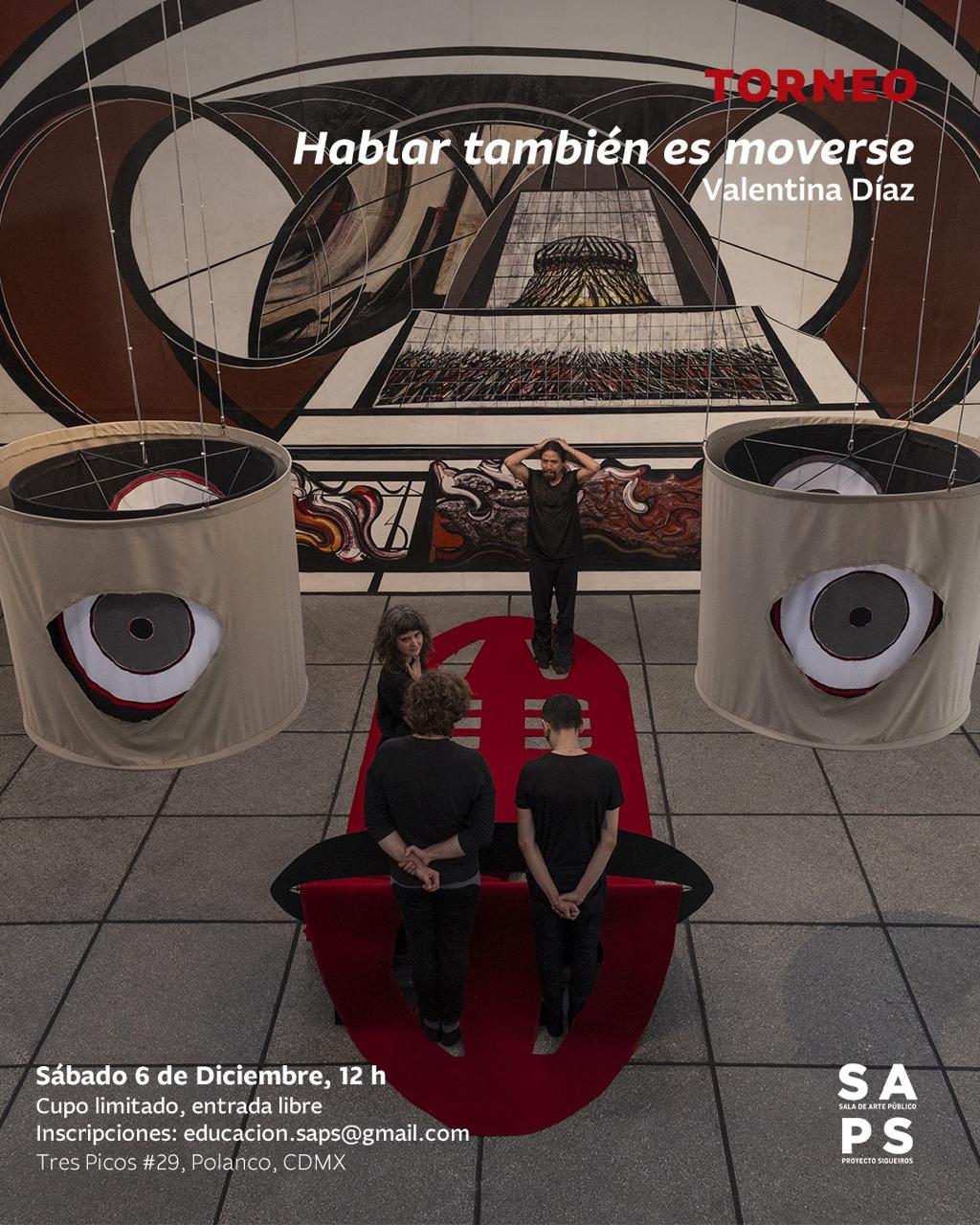 Para esta activación, Díaz propone un torneo participativo integrado por dos rondas y cuatro equipos de dos personas, quienes competirán en dinámicas verbales y corporales que dialogan con la noción de movimiento presente en La marcha de la humanidad de Siqueiros, explorando el ritmo, el desplazamiento y la interacción como parte esencial de su práctica artística. El equipo ganador recibirá un paquete de publicaciones históricas de la SAPS.