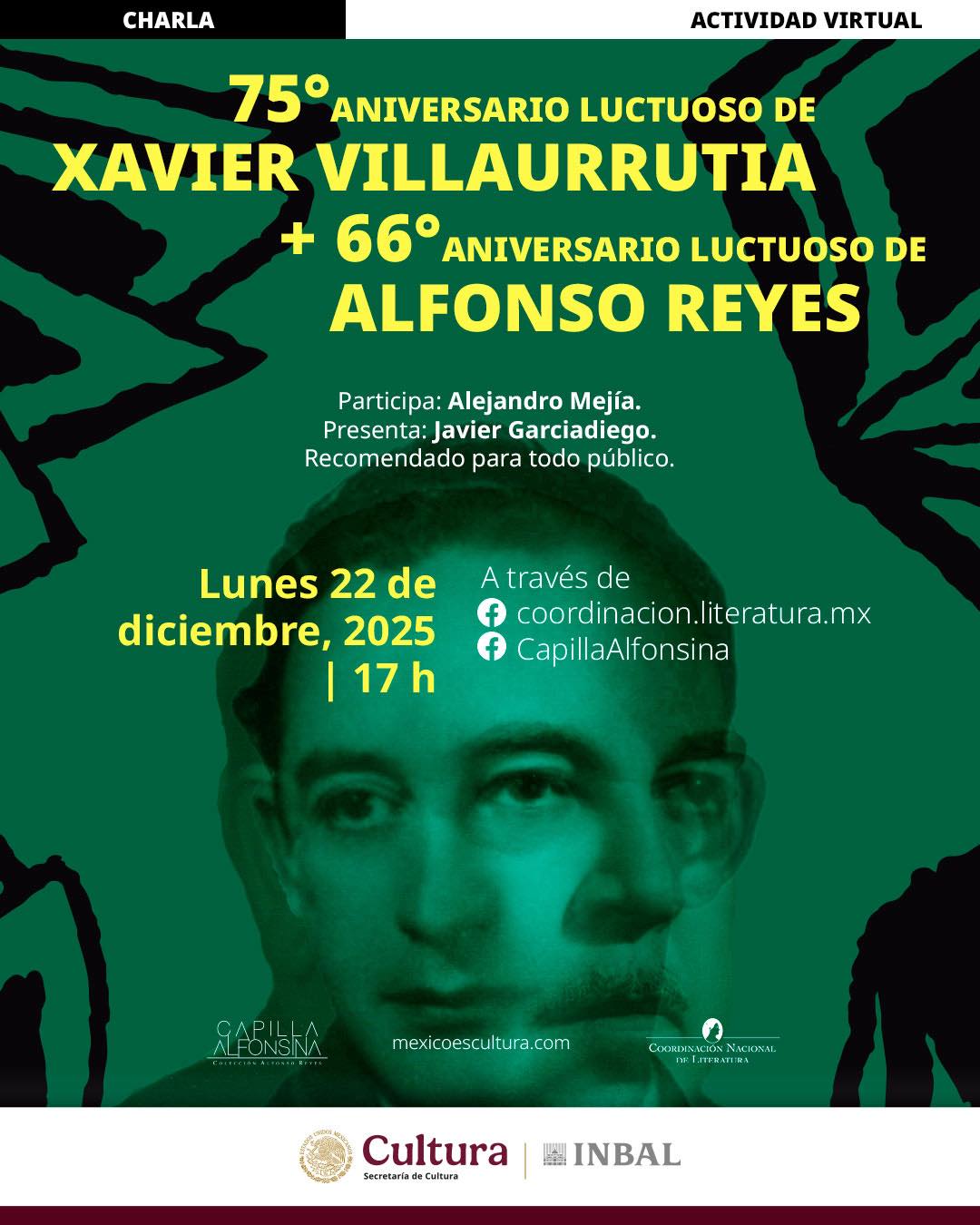 En este mismo marco y con motivo del 66 aniversario luctuoso de Alfonso Reyes, Alejandro Mejía ofrecerá una charla para honrar la memoria de estas dos figuras fundamentales de las letras mexicanas. En ella explorará los paralelos entre sus trayectorias, sus afinidades literarias y la vigencia de su legado. La actividad se realizará el lunes 22 de diciembre, a las 17 horas, a través del Facebook de la CNL y de la Capilla Alfonsina. La presentación estará a cargo de Javier Garciadiego, director de este recinto del INBAL.